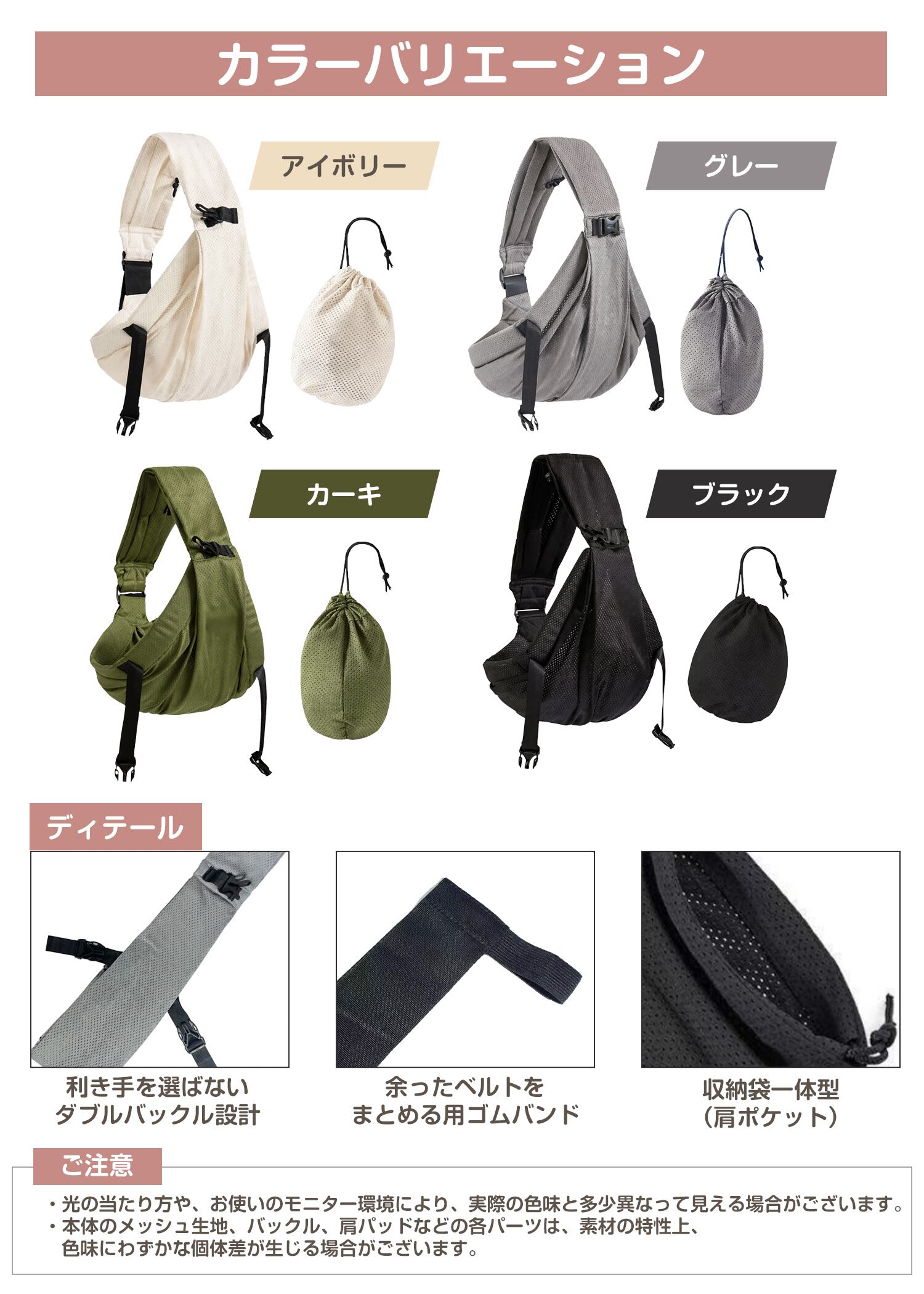 重さはわずか185g(iPhone17相当)。肩パッド部分に収納袋が内蔵されている「ポケッタブル仕様」なので、脱いだら丸めてバッグへポン。かさばる抱っこ紐の持ち運びストレスから解放されます。