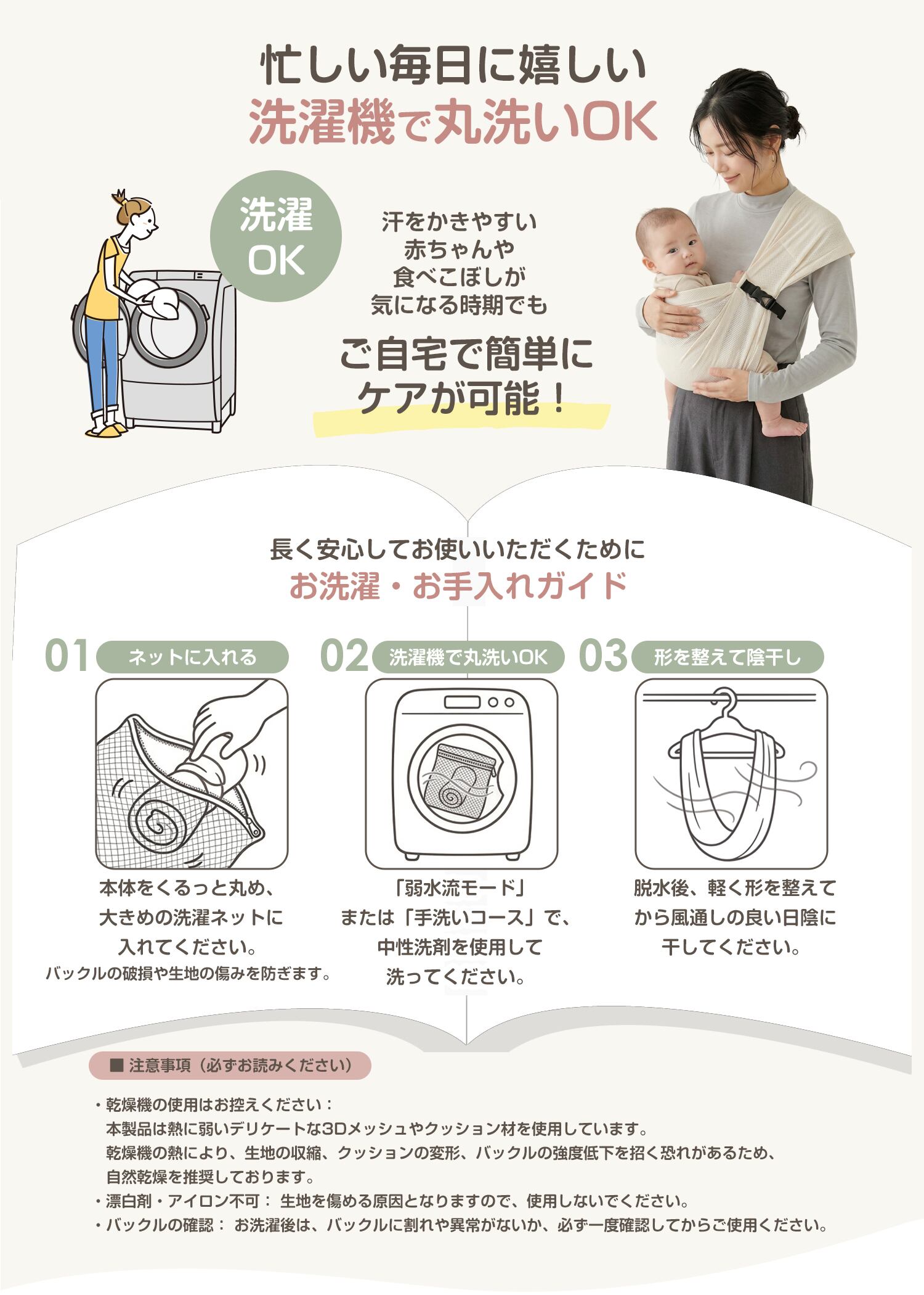汗っかきな赤ちゃんのために、全面に通気性抜群の3Dメッシュを採用。熱を逃がし風を通すので、夏場の密着抱っこも快適です。汚れが気になったら洗濯機で丸洗いできるので、常に清潔を保てます。
