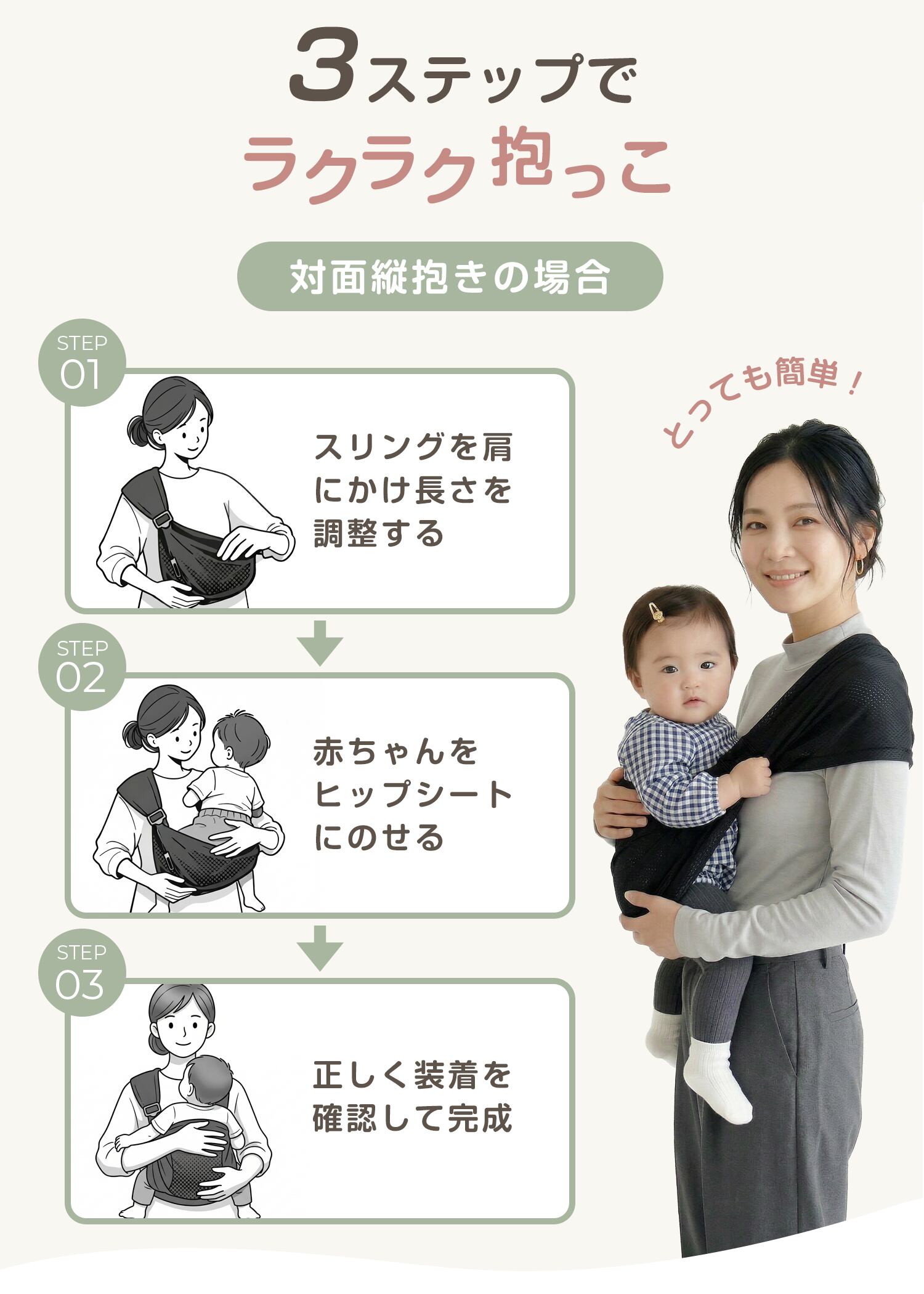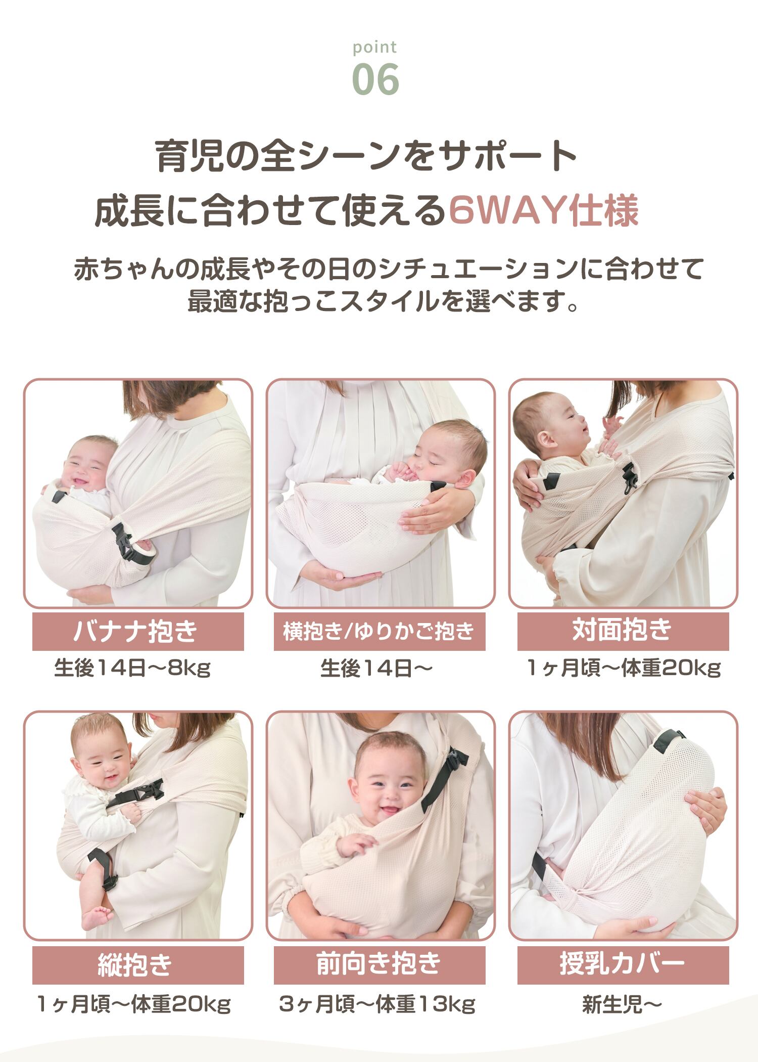 生後14日からの「横抱き(バナナ抱き)」から、首すわり後の「対面抱き」「前向き抱き」、4歳頃までの「腰抱き」まで、これ1本で成長に合わせた最適なスタイルを選べます。授乳カバーとしても使える万能設計です。