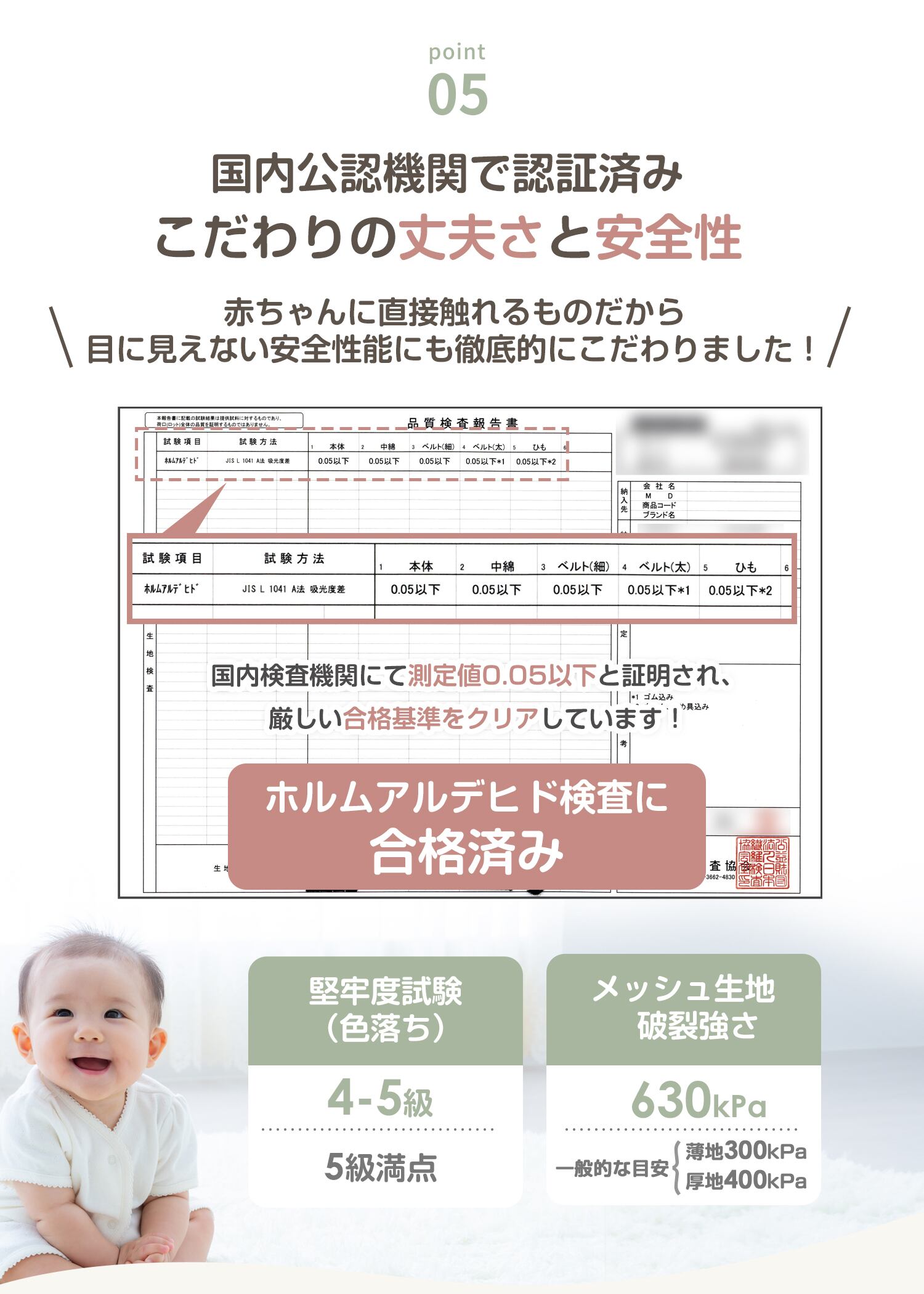 大切な赤ちゃんが触れるものだから、ホルムアルデヒド検査(乳幼児用基準)に合格。生地の強度(630kPa)や堅牢度も国内試験をクリアしており、安全性と耐久性を徹底しています。