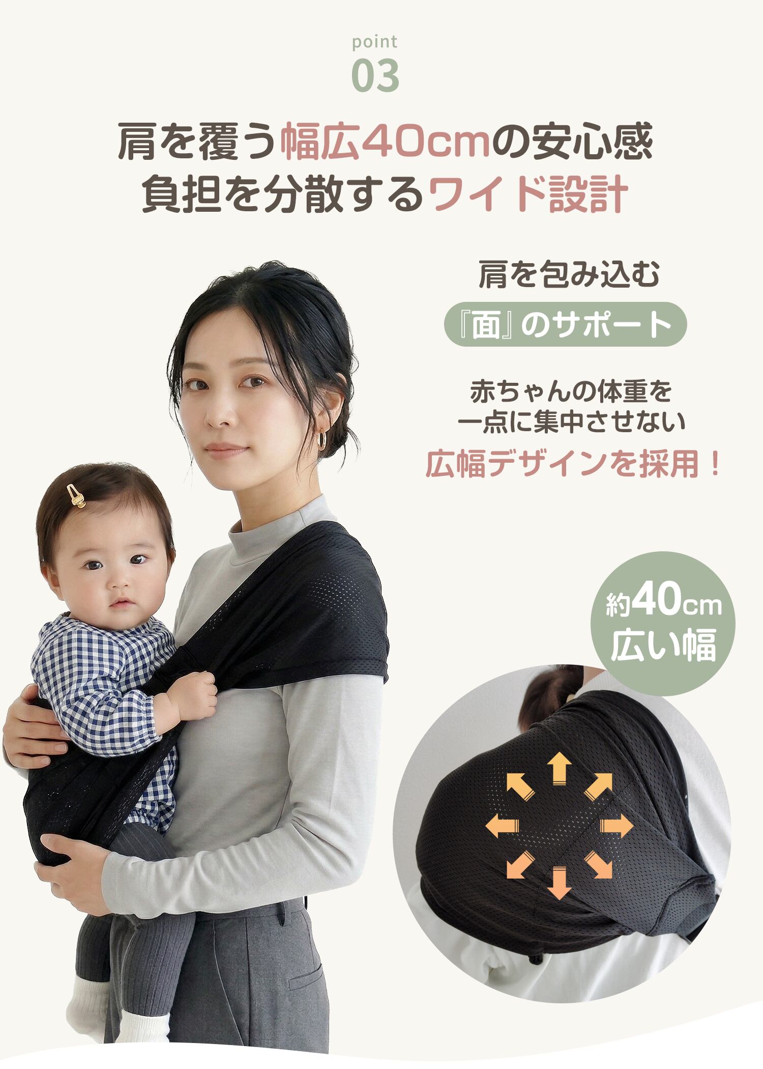一般的なスリングより広い「幅広40cm」のショルダー部分が、赤ちゃんの体重を肩全体に分散。ピンポイントの食い込みを防ぎ、長時間の寝かしつけや外出でも、肩や首への負担を劇的に軽減します。