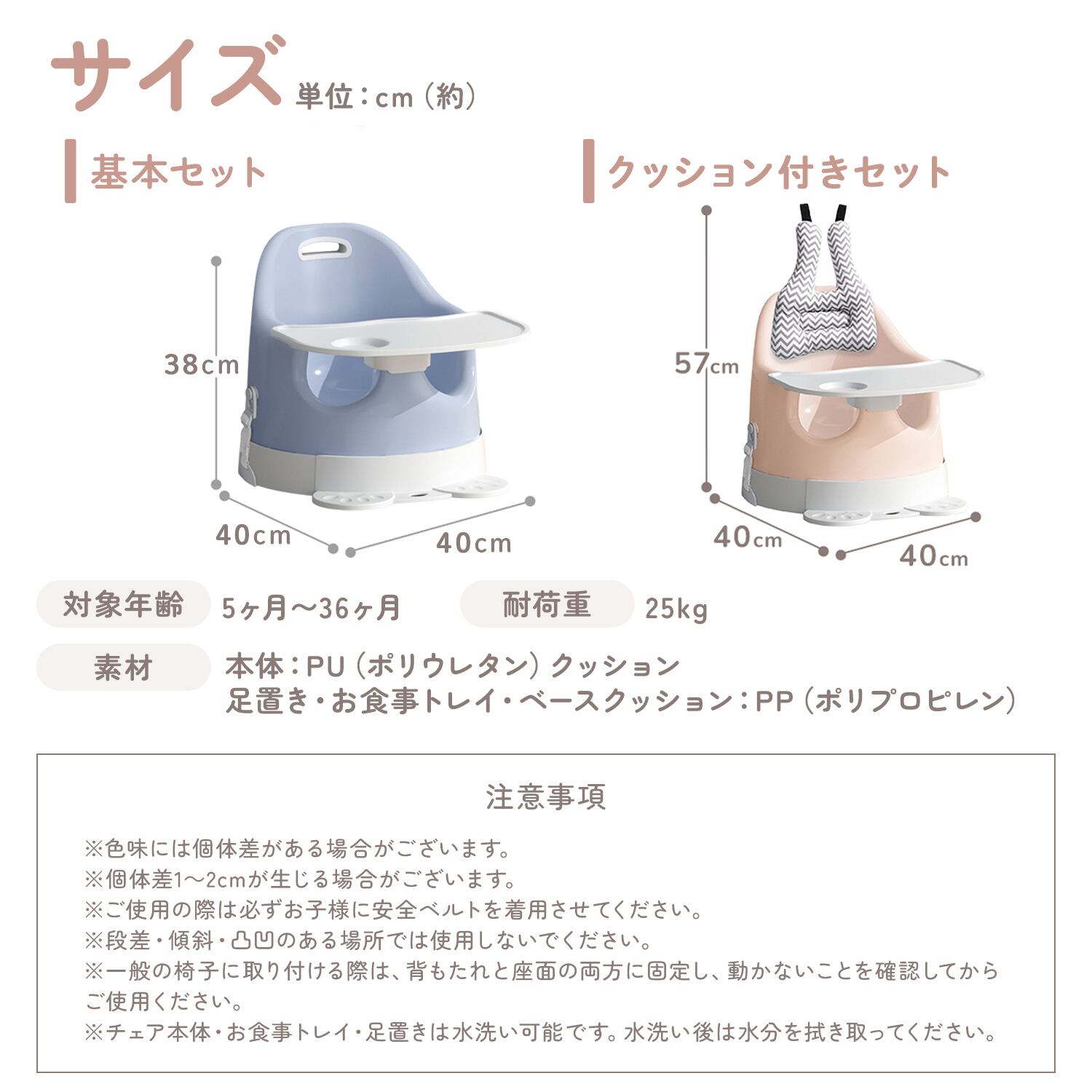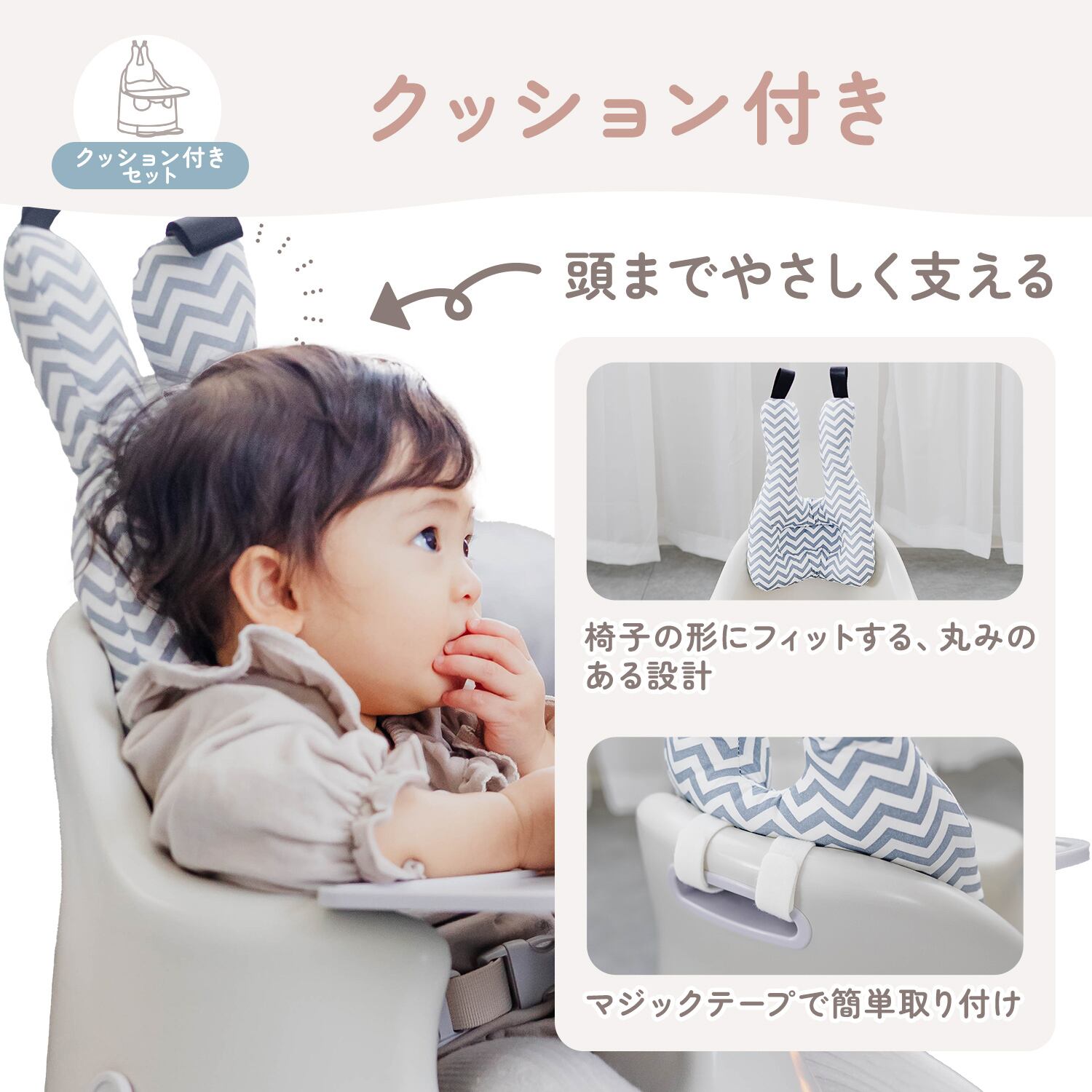 クッション付きセットは、頭までやさしく支える設計。丸みのある形状で椅子にフィットし、赤ちゃんの体をやさしく包み込みます。マジックテープで簡単に取り付けできるため、必要に応じて手軽に使えます。