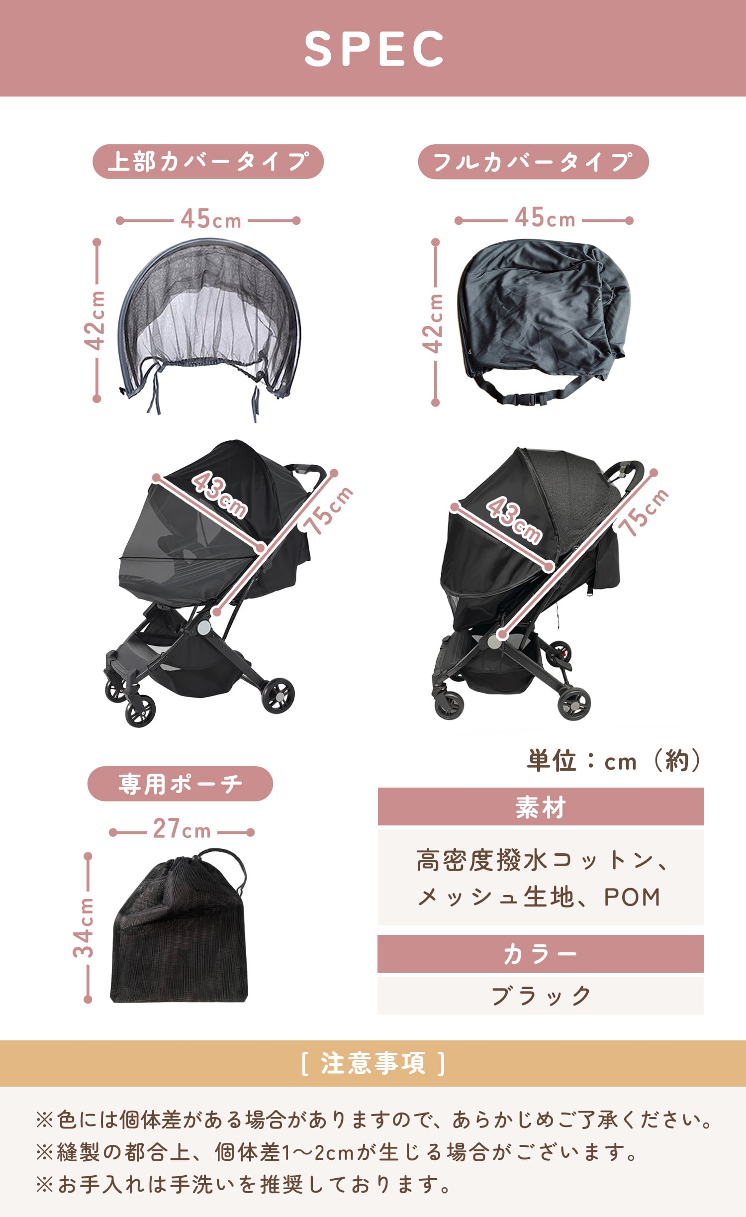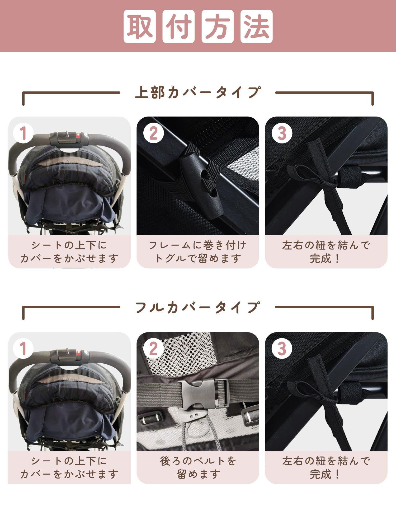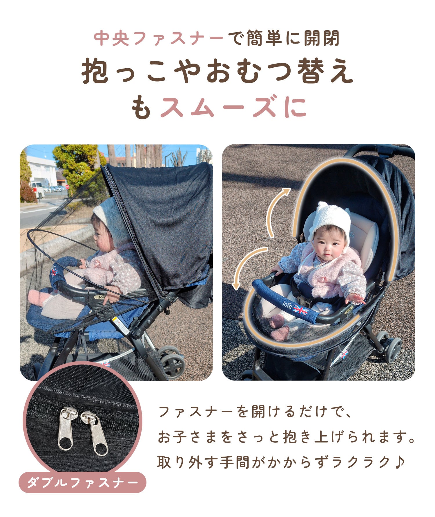 さっと使える上部カバータイプと、しっかり守るフルカバータイプの2種類をご用意。シーンや天候に合わせて使い分けが可能です。ダブルファスナー仕様で抱っこやおむつ替えもスムーズに行えます。
