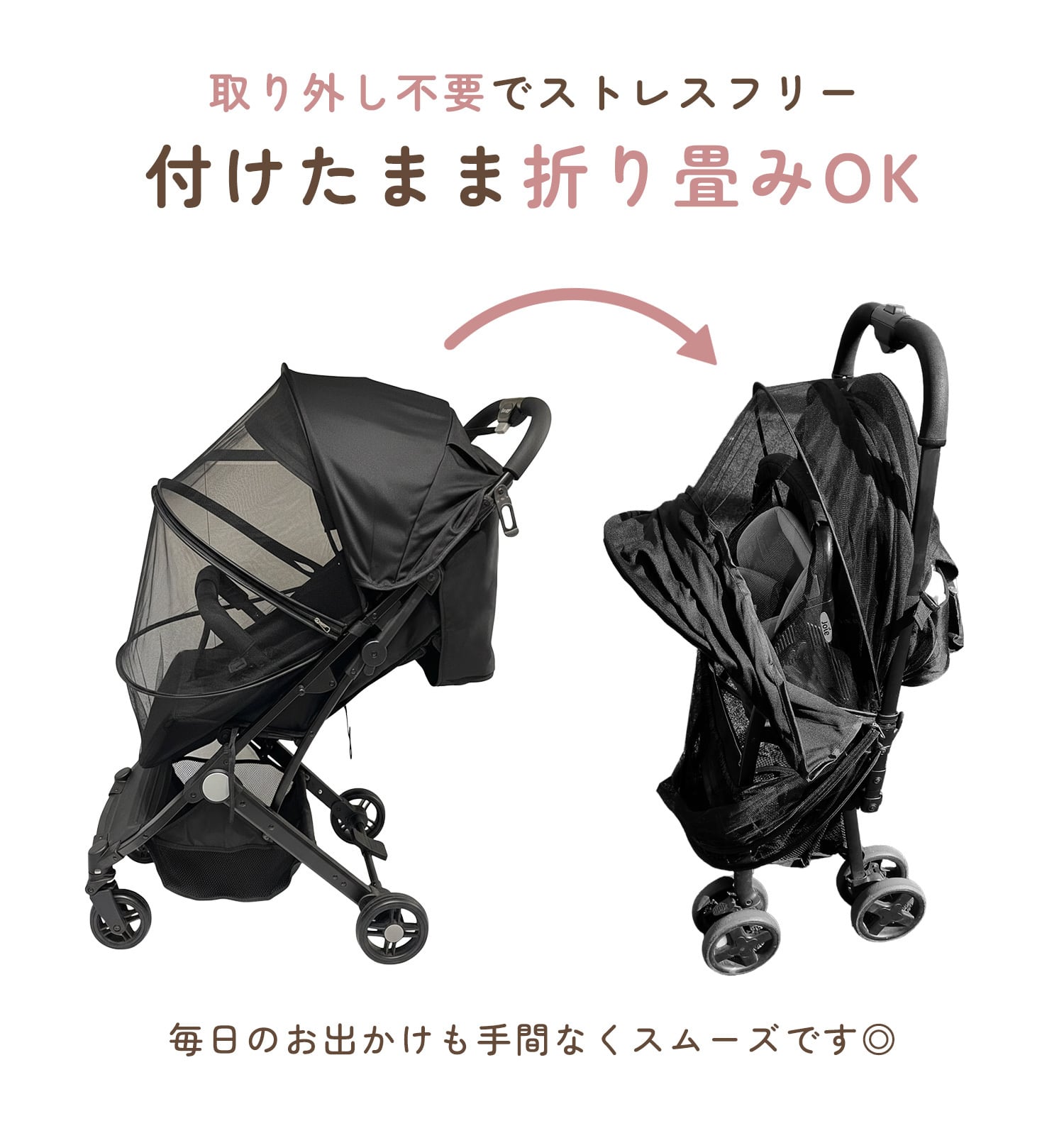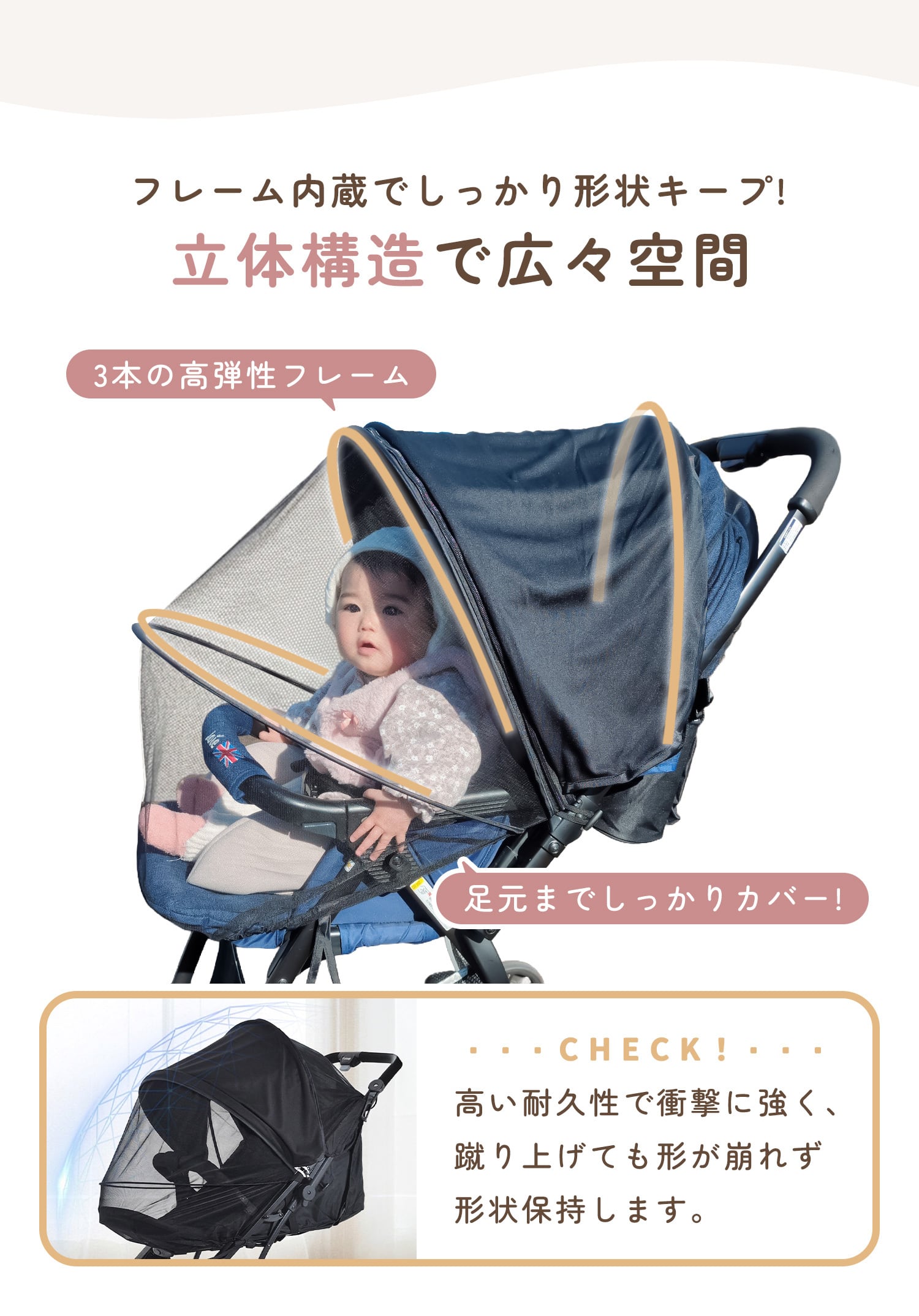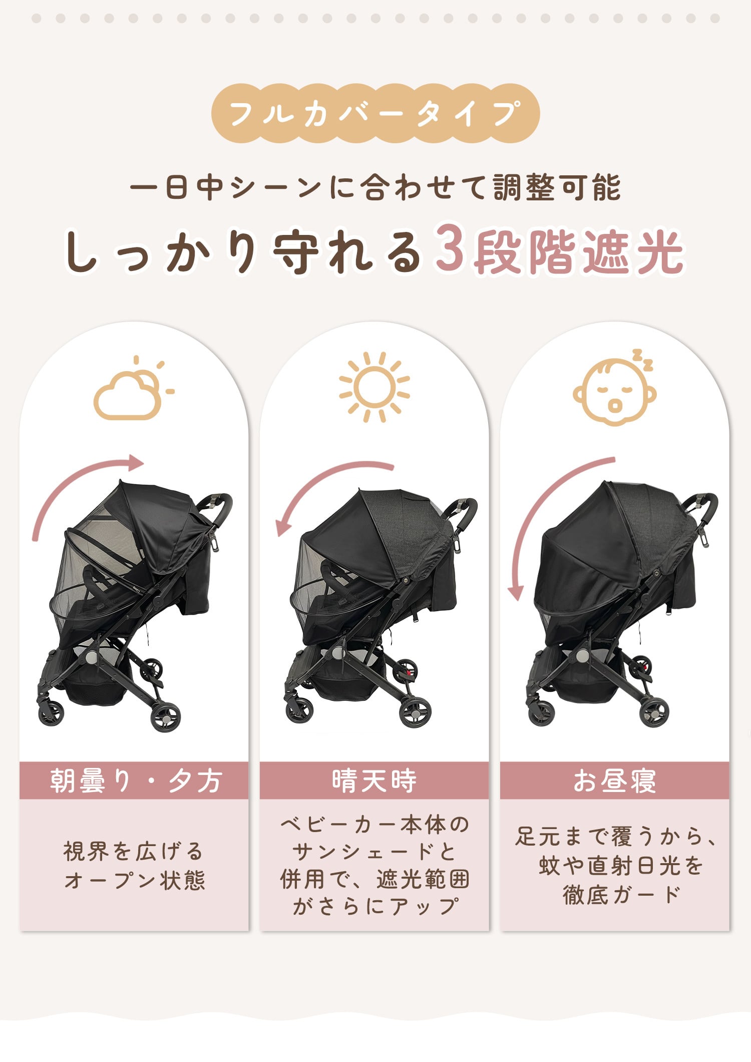 さっと使える上部カバータイプと、しっかり守るフルカバータイプの2種類をご用意。シーンや天候に合わせて使い分けが可能です。ダブルファスナー仕様で抱っこやおむつ替えもスムーズに行えます。