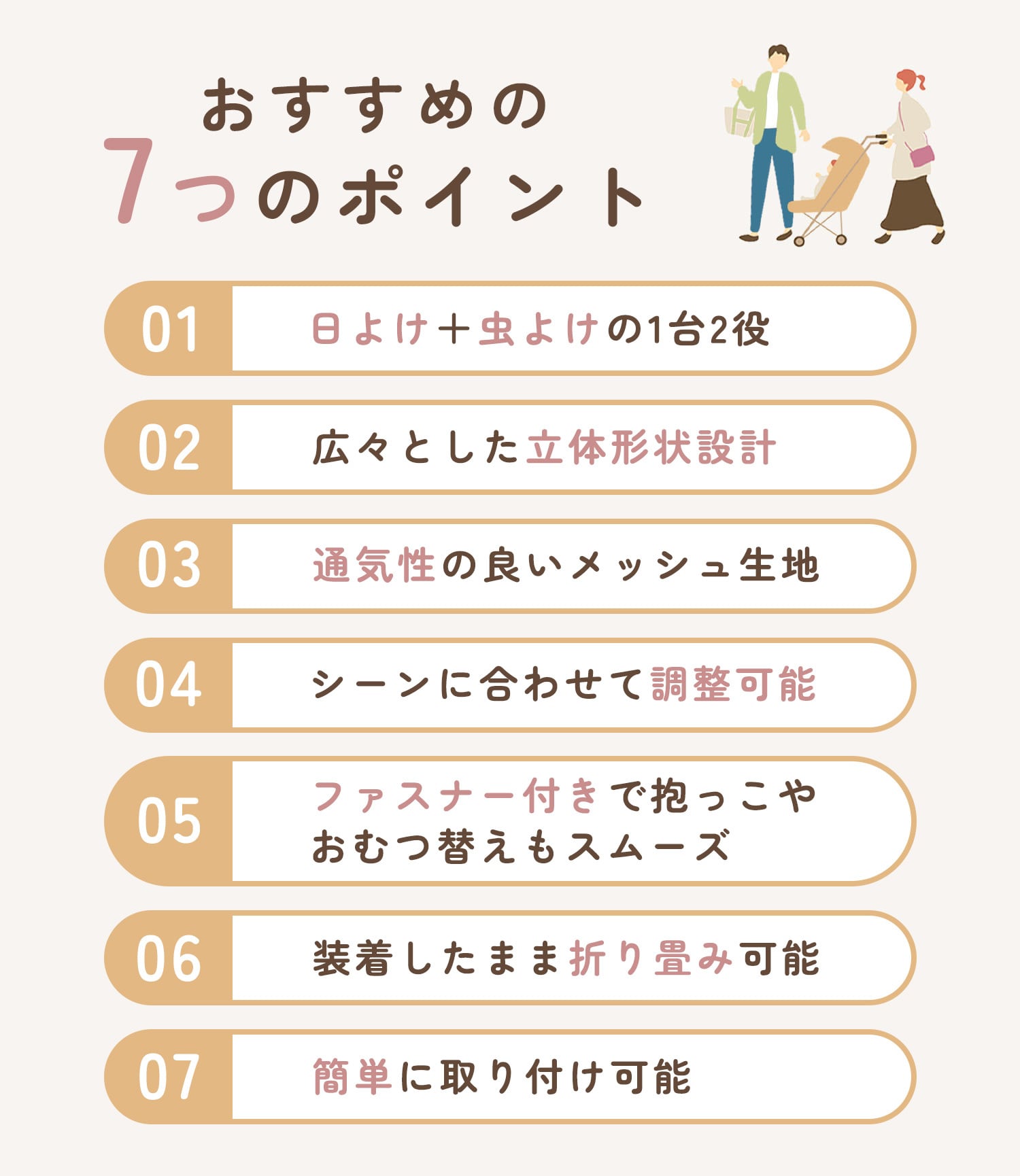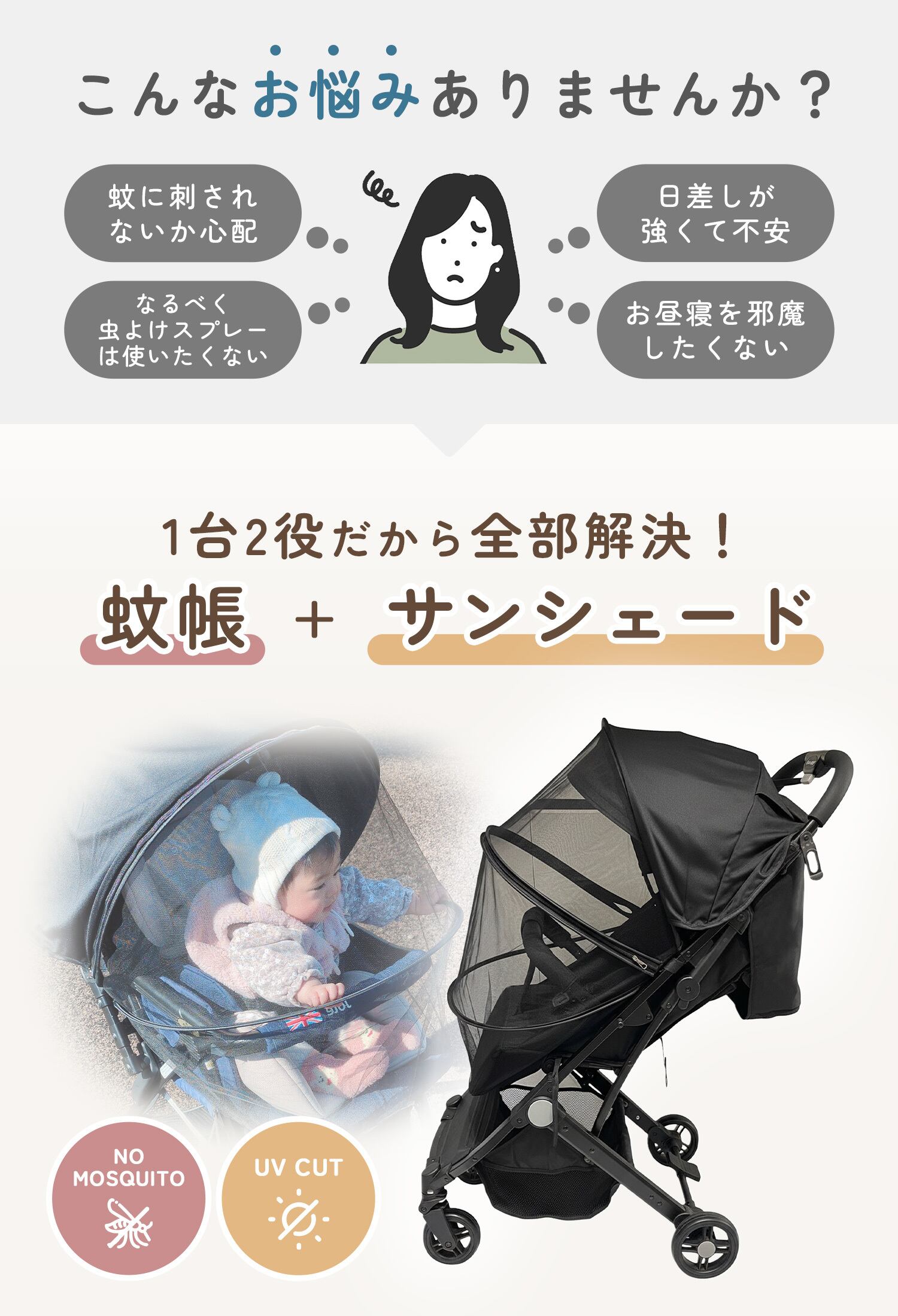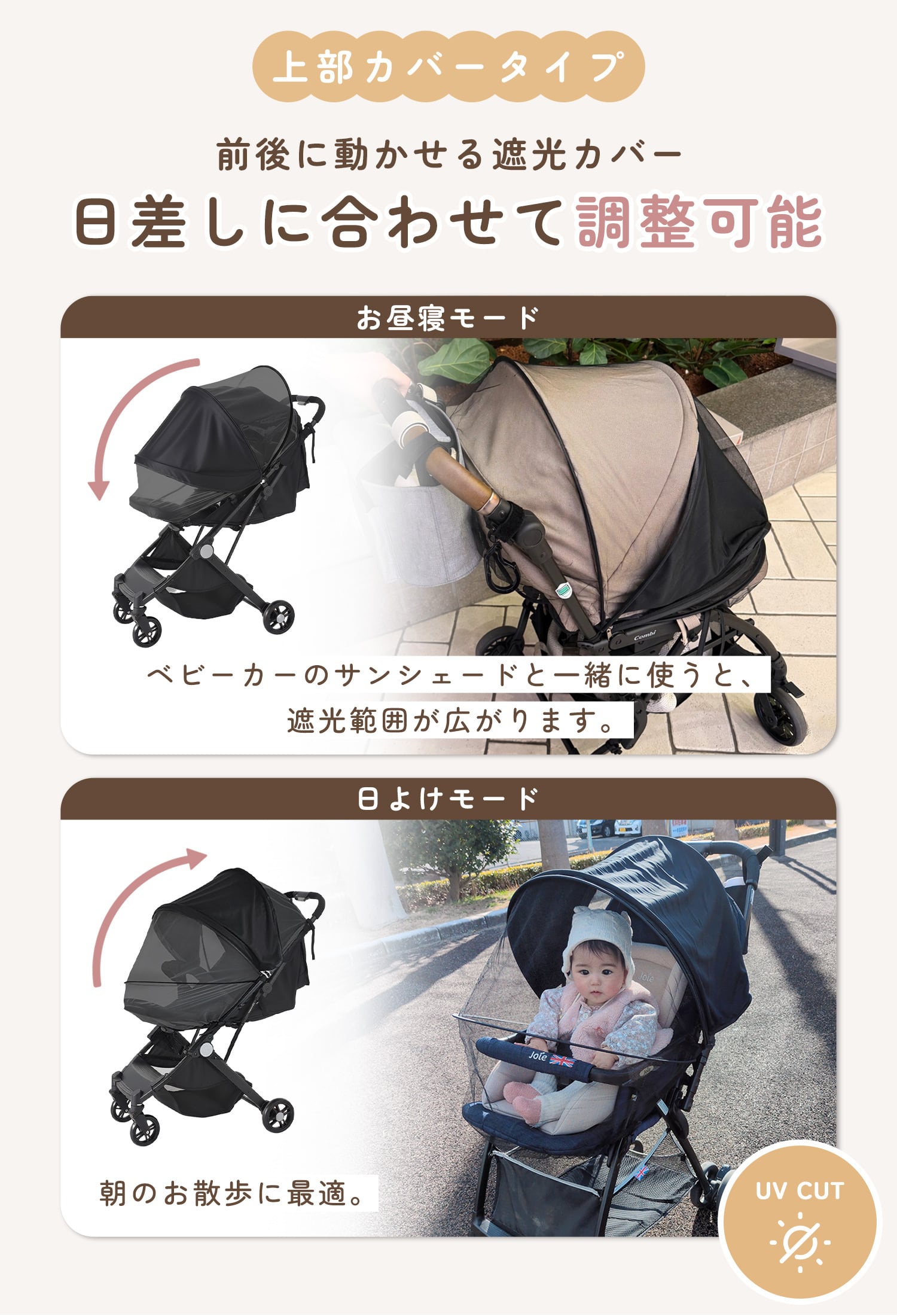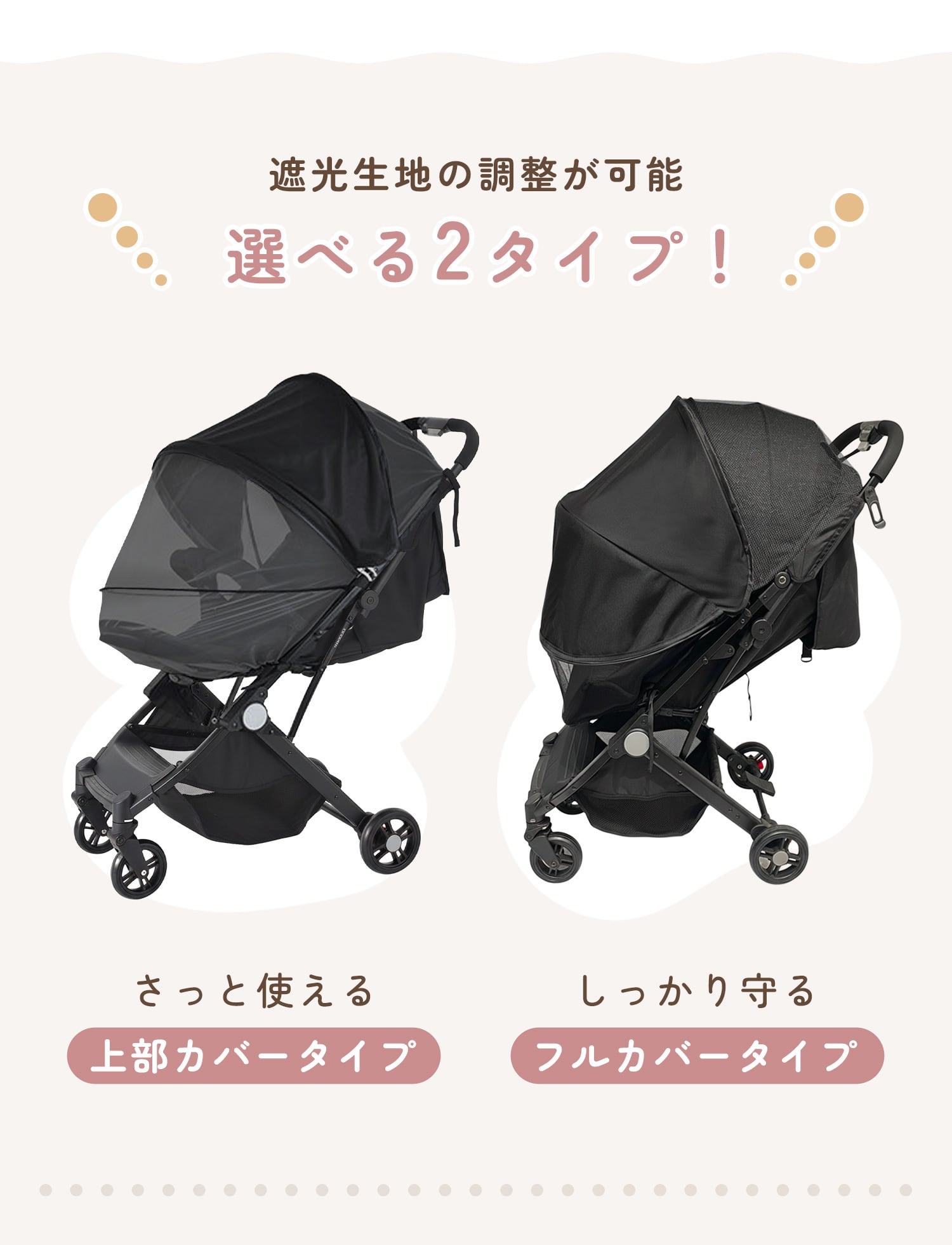 さっと使える上部カバータイプと、しっかり守るフルカバータイプの2種類をご用意。シーンや天候に合わせて使い分けが可能です。ダブルファスナー仕様で抱っこやおむつ替えもスムーズに行えます。