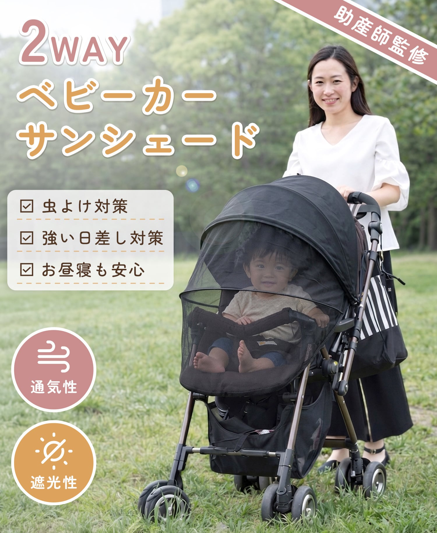 強い日差しや気になる虫から赤ちゃんをしっかり守るベビーカーサンシェード。遮光性と通気性を両立した設計で、お出かけ中も快適な空間をキープします。お昼寝中も外部刺激をやわらかく遮り、心地よい時間をサポートします。