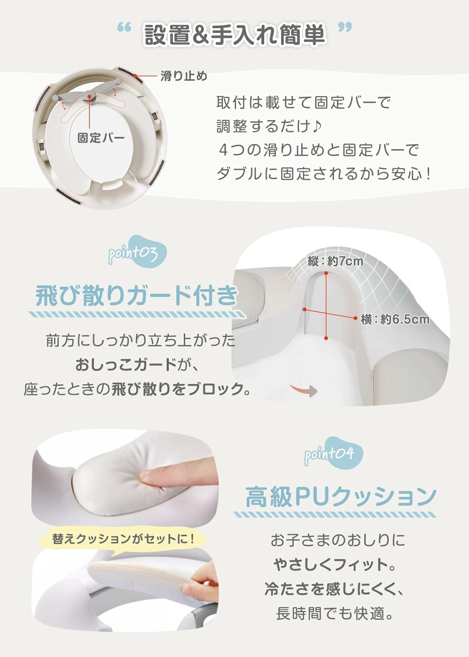 取っ手&おしっこガード付きで安心。座りやすくトレーニングに最適。