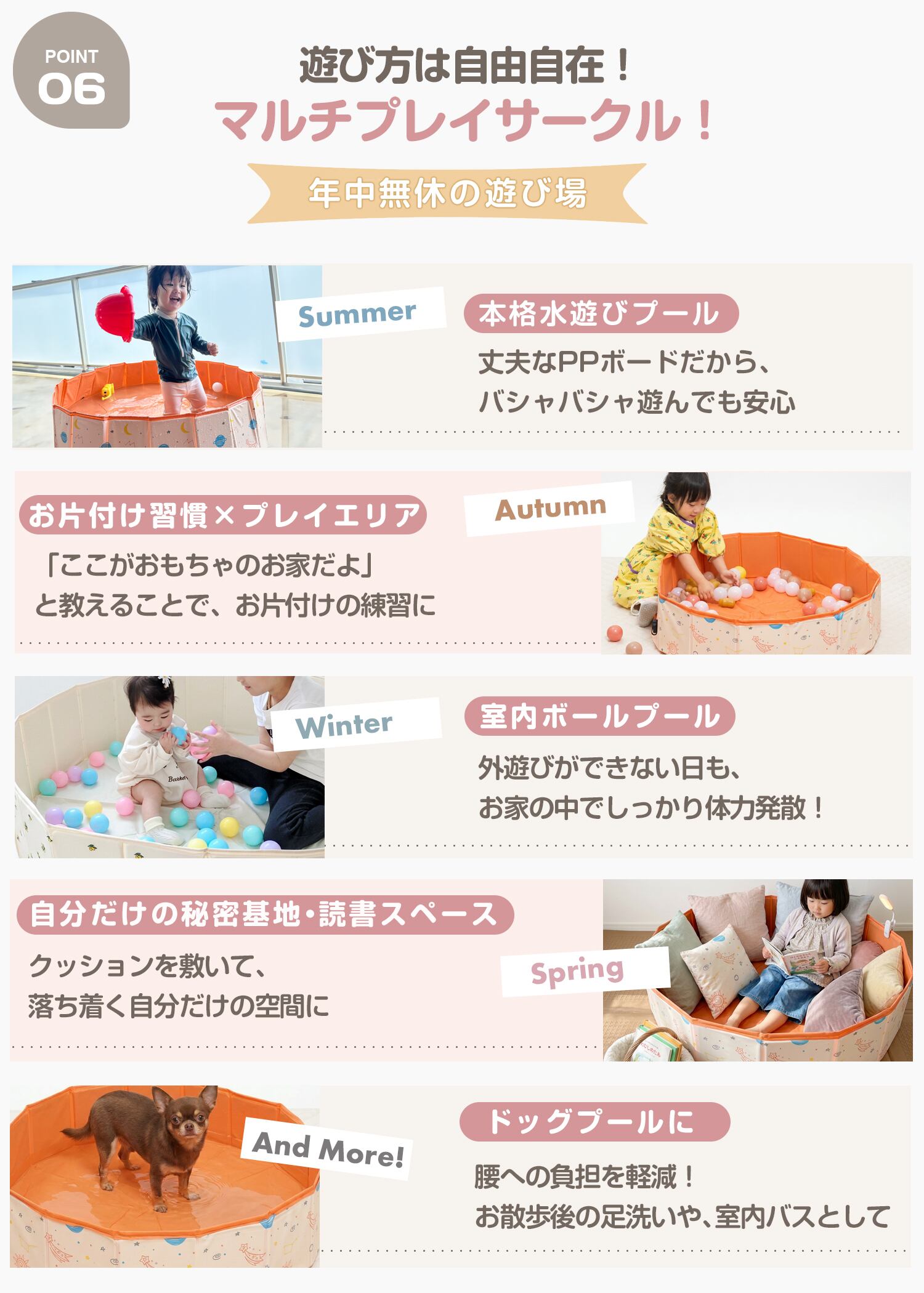 夏の水遊びはもちろん、秋はおもちゃのお片付け練習、冬は室内のボールプール、