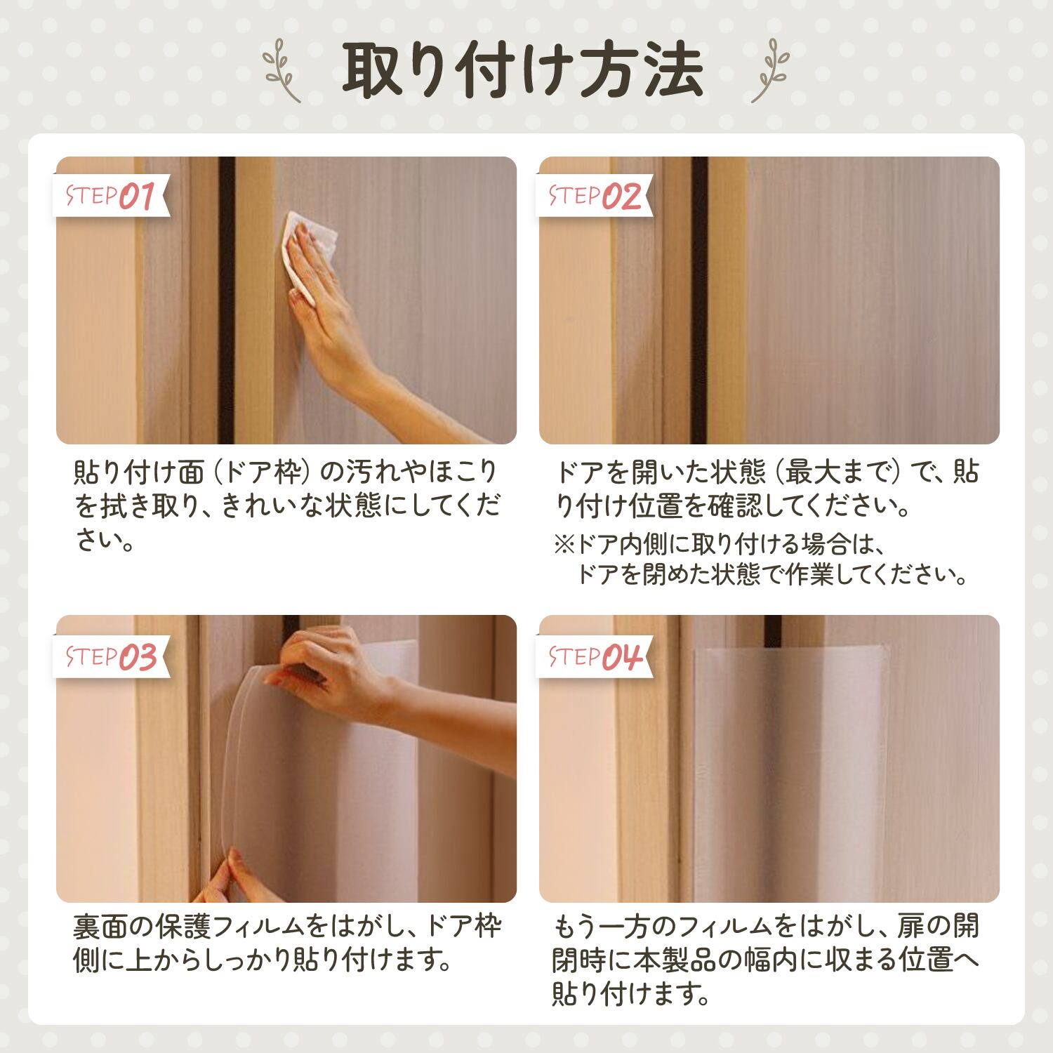 しなやかなPP素材を使用しており、ドアの動きに自然にフィットします。開閉の動作を妨げにくく、毎日の生活の中でも違和感なく使用できます。