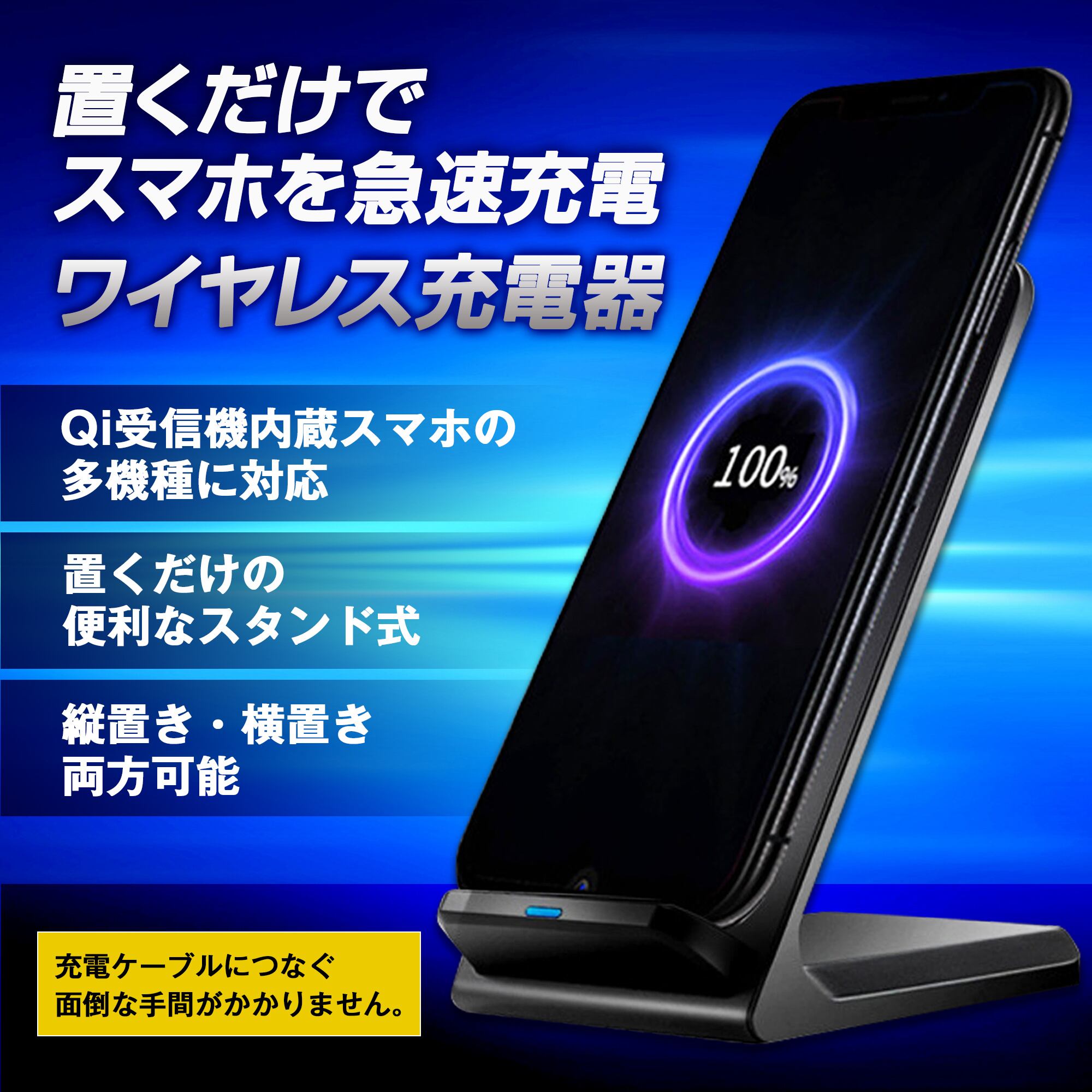 置くだけでQi対応のスマホを充電できる、便利なスタンド式ワイヤレス充電器です。