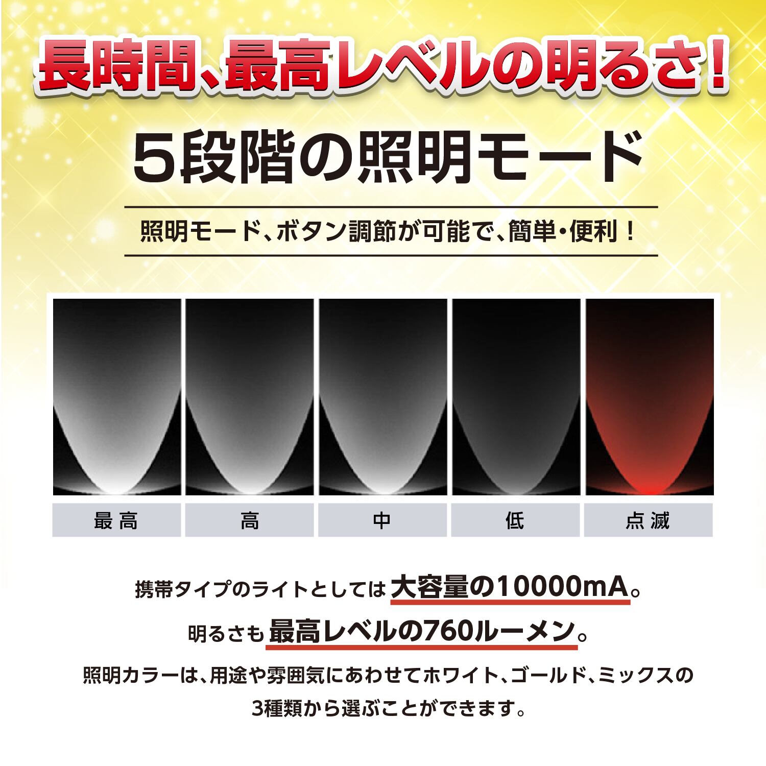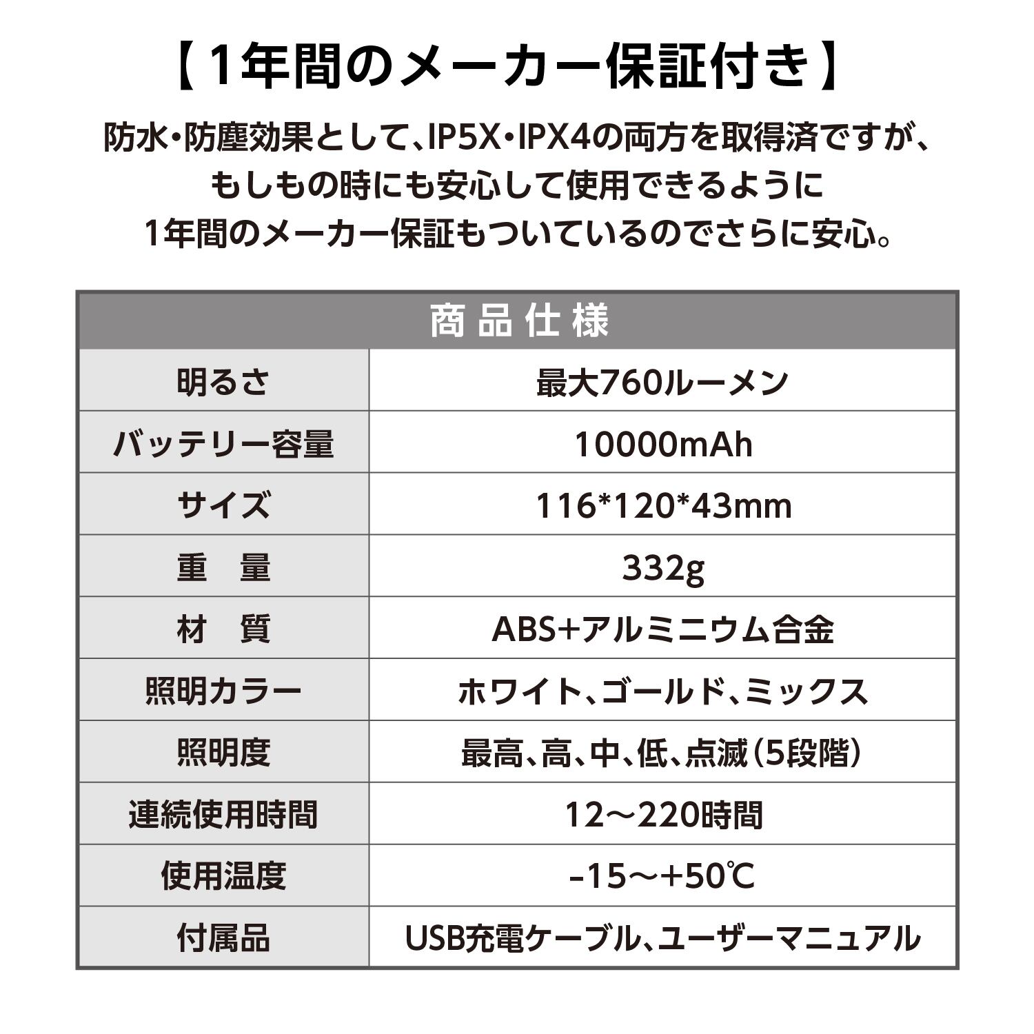 携帯タイプのライトとしては大容量の10000mA。明るさも最高レベルの760ルーメンなので、とにかく明るいのが特徴。