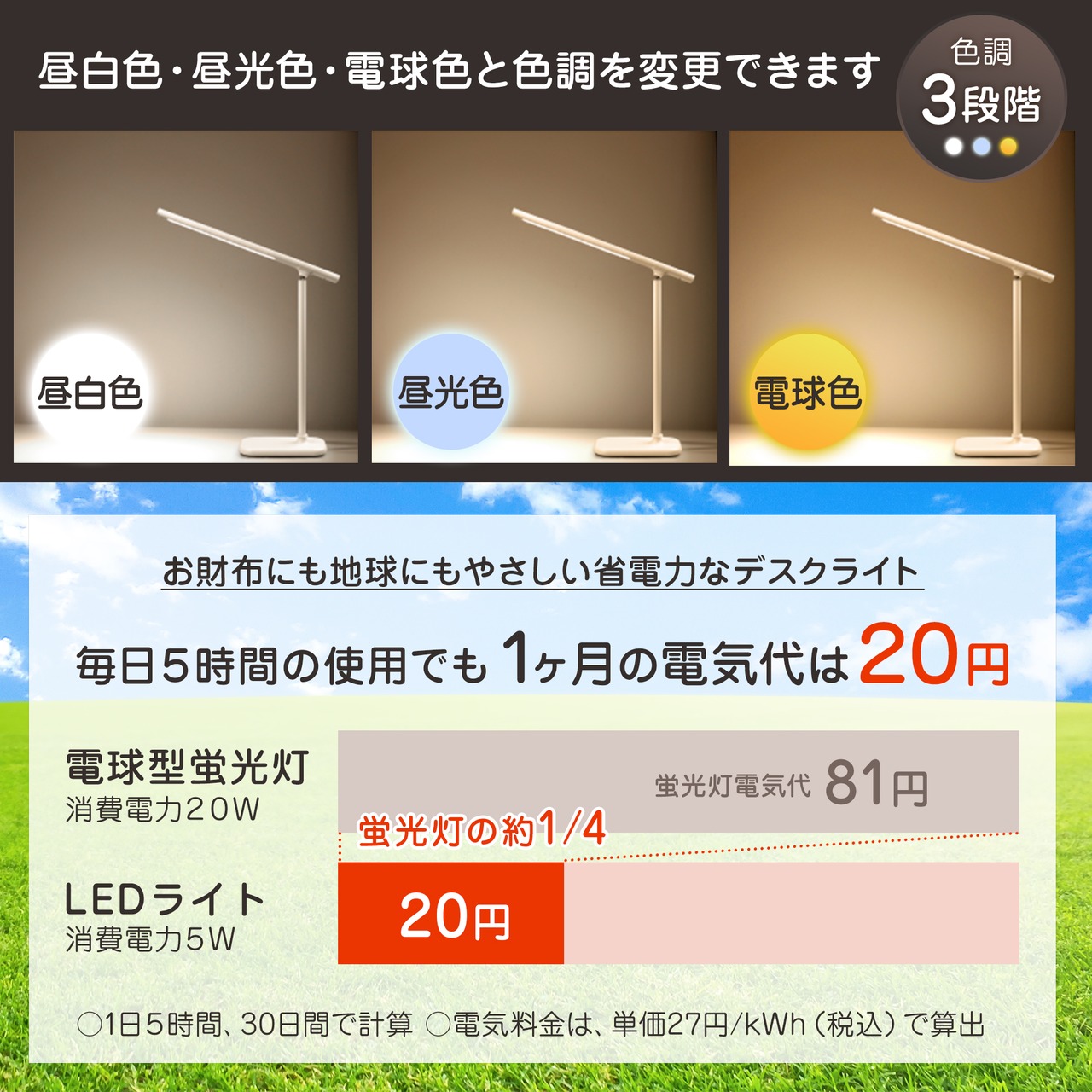 1日あたり5時間の使用でも1ヶ月の電気代は20円。一般的な電球型蛍光灯(20w)は1ヶ月81円なので、比較すると1/4のコストに。お財布にも地球にもやさしい省電力なデスクライトです。
