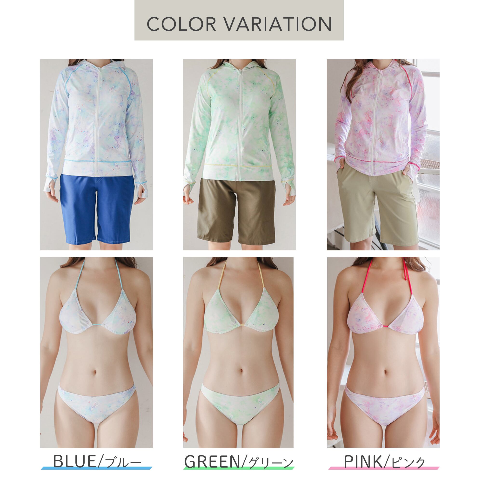 長袖ラッシュガード、ショートパンツ、ビキニ上下の4点セット。