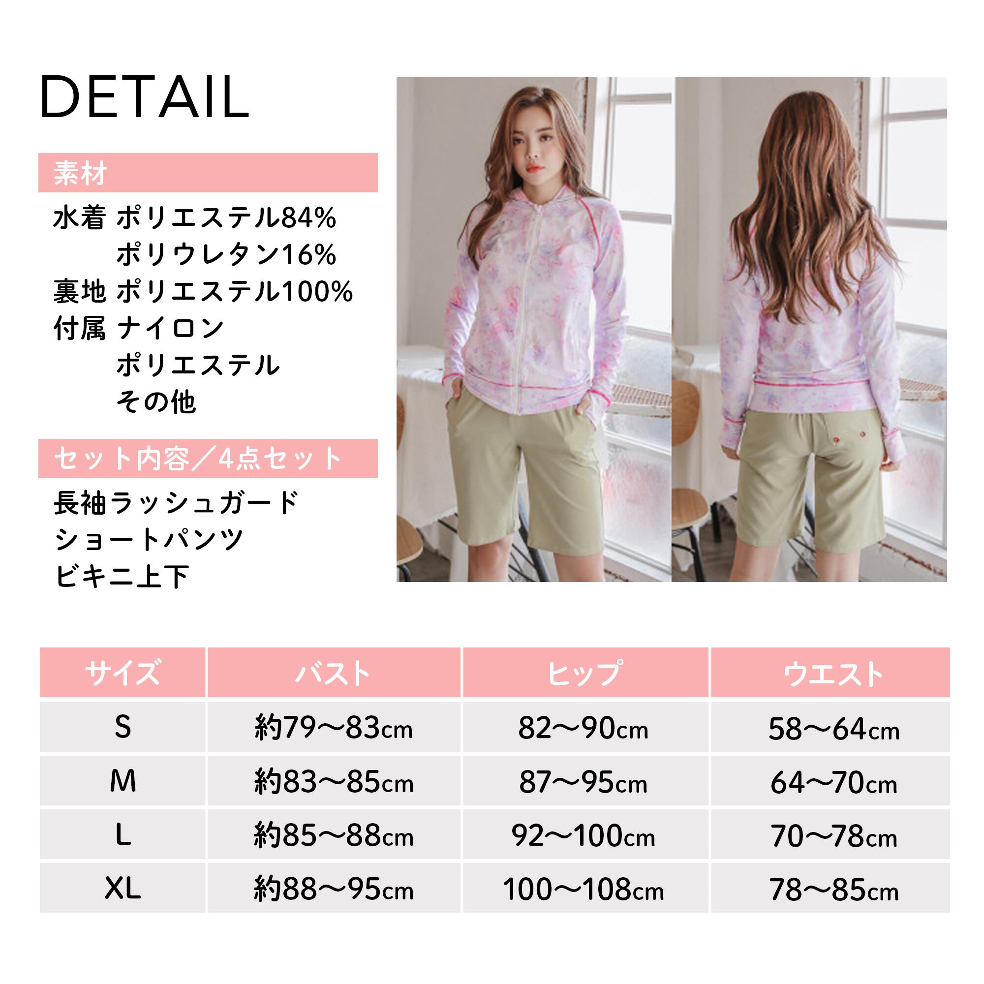 ○セット内容:4点セット(長袖ラッシュガード、ショートパンツ、ビキニ上下)