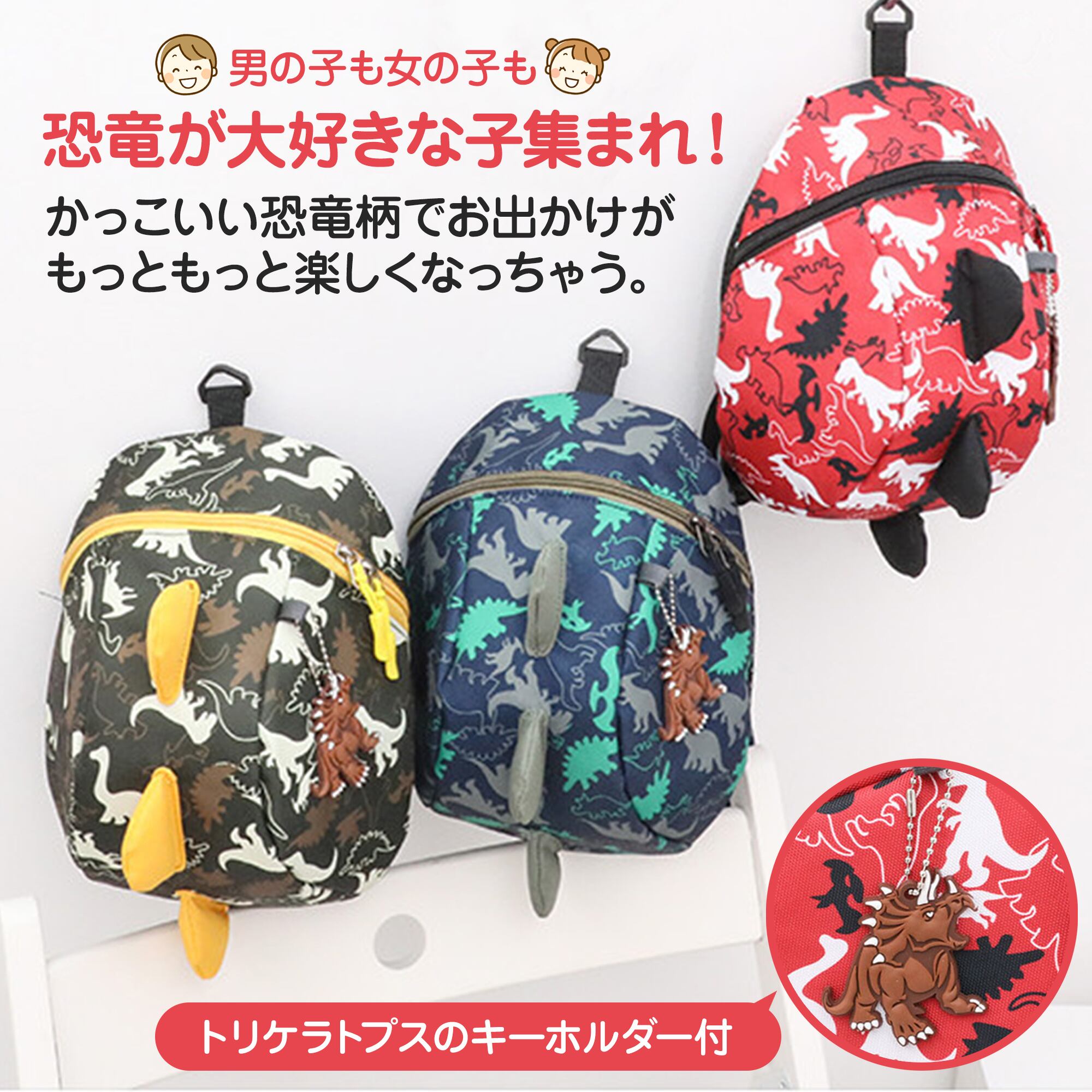 男の子でも女の子でも恐竜が好きなお子様にぴったりな恐竜柄リュック。とさかがアクセントになったかっこいいリュックで、トリケラトプスのキーホルダー付きです。