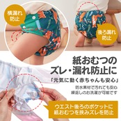 【紙おむつのズレ、漏れ防止に】元気に動く赤ちゃんのおむつズレや漏れはママ&パパの悩みの元。おむつカバーなら、ウエスト後ろのポケットに紙おむつを挟んでズレをしっかりと防ぎます。股のギャザーで横漏れ防止、背中のギャザーで、後ろ漏れを防止。防水素材だから、汚れても安心。