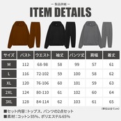 ○セット内容:トップス、パンツの2点セット ○カラバリ:グレー、ホワイト、ブラック、モカベージュ、ブラウン ○サイズ:M、L、XL、2XL、3XL ○素材:コットン35%、ポリエステル65%