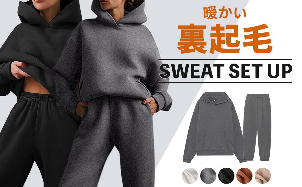 表生地はサラッとした肌触りに、裏生地はチクチクしない滑らかな起毛素材を採用。保温性が高く肌寒い日に気軽に着用できるスウェットのセットアップ。