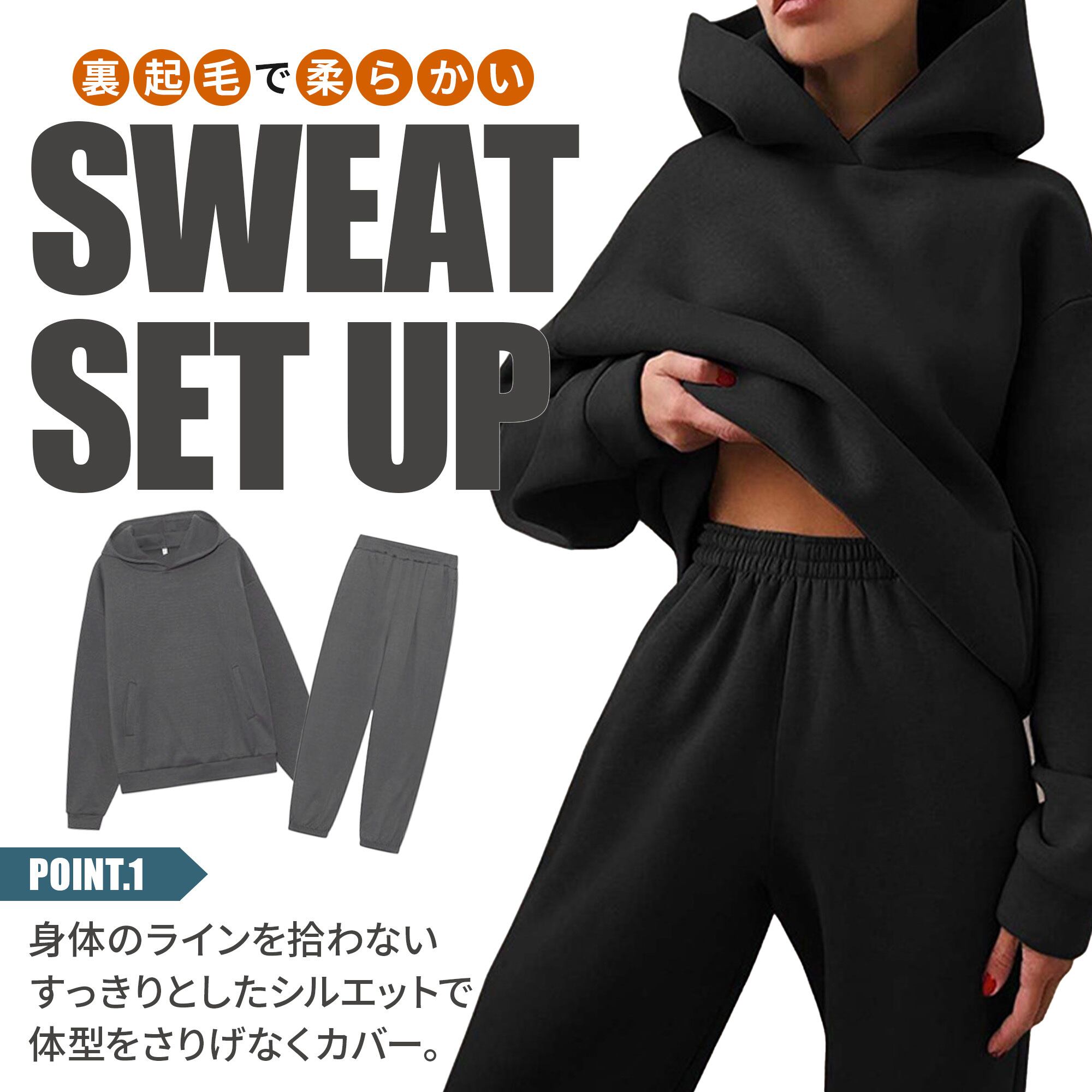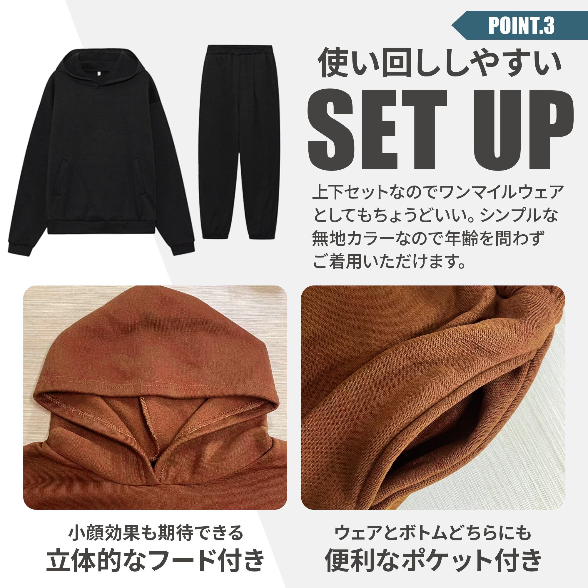 【デザインのこだわり】<トップス>大きめのフード、旬なドロップショルダー、全体的にゆとりのあるオーバーサイズシルエットで抜け感のあるデザイン。袖口と裾部分はリブ仕様となっているので、ルーズになりすぎない着こなしにが可能。<ボトムス>パンツは裾にゴムを入れ裾上にたまりが作れるジョガーパンツシルエット。裾にゴムが入っているので靴に重ならず靴下や靴を強調した着こなしも楽しめます。ウエスト部分はゴム仕様で脱ぎ履きしやすく着用感もストレスフリー。トップスとパンツにはそれぞれ左右にポケットがついており、携帯や鍵などちょっとした小物を収納することができます。