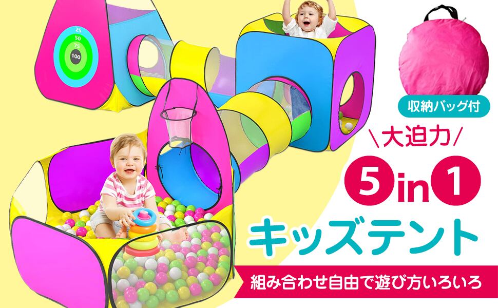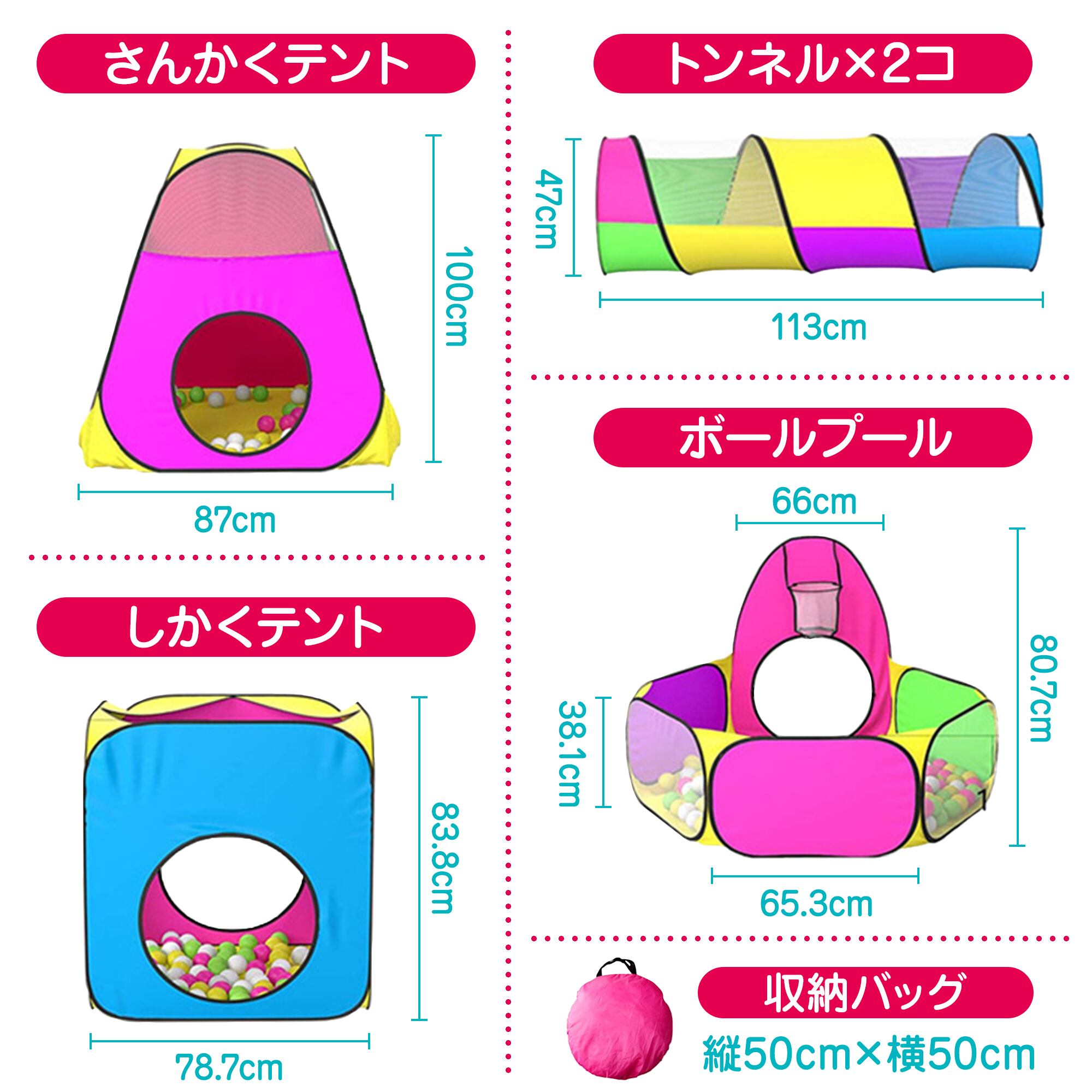 【商品仕様】〇セット内容 三角テント、四角テント、ボールプール、トンネル2個、収納袋 ※ボールは付いておりません。 〇サイズ 三角テント:87cm×100cm、四角テント:78.7cm×83.8cm、ボールプール:プールの1辺65.3cm、プールの高さ38.1cm、バスケットゴール部66cm×80.7cm、トンネル:長さ113cm 直径47cm 収納時:50㎝×50㎝ 〇素材 生地:ポリエステル製 ワイヤー:スチール製