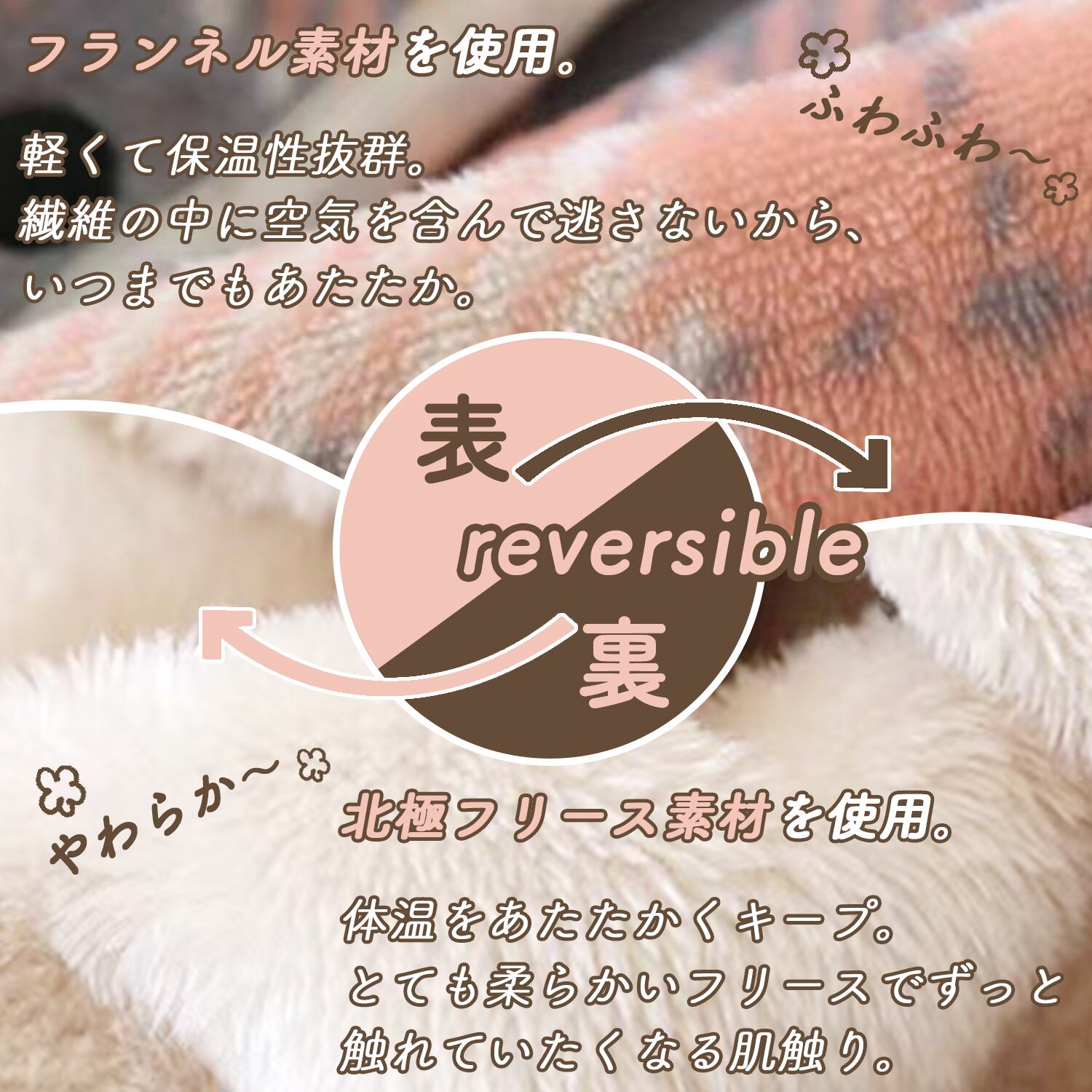 表はフランネル素材で軽くて保温性抜群。繊維の中に空気を含んで逃さないからいつでも暖か。裏はフリース素材で、体温を暖かくキープ。とても柔らかいフリースでずっと触れていたくなるふわふわ素材。リバーシブルで使えます。
