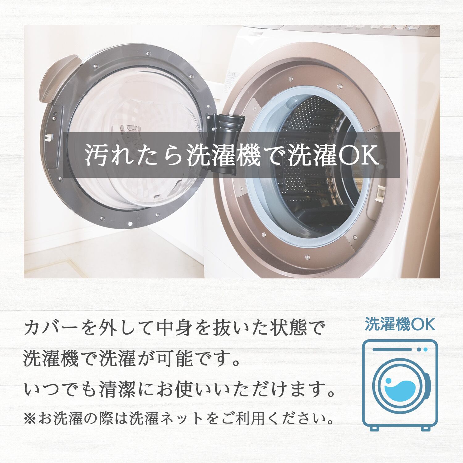 カバーを外して中身を抜いた状態で洗濯機で洗濯が可能です。いつでも清潔にお使いいただけます。
