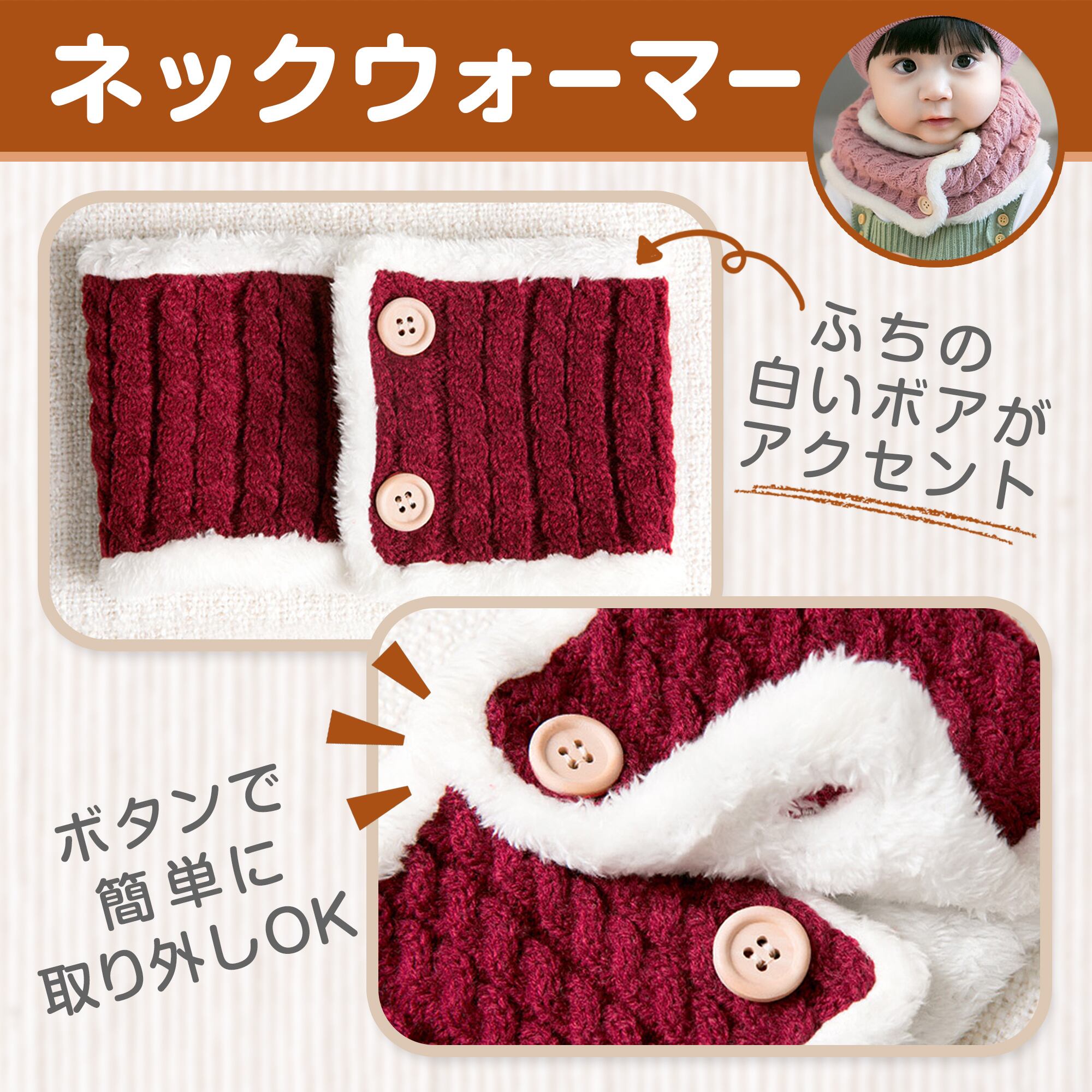 ニット帽とお揃いのデザインで作られたネックウォーマーは、ボタンで取り外しも楽々。寒さに応じてつけたり外したりしてご使用いただけます。見た目にも暖かく、かわいい白いボアがポイントです。