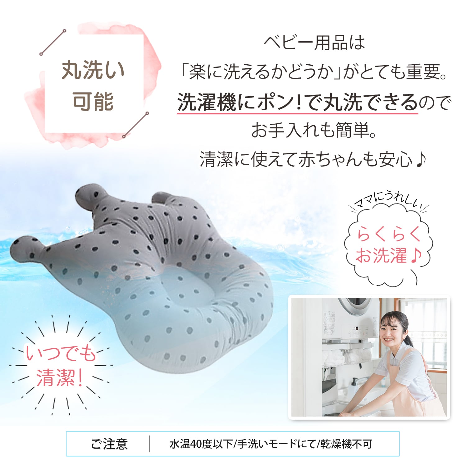 丸洗いできるので、お手入れ楽々。いつでも清潔に使えて赤ちゃんも快適。忙しいママにも嬉しい!