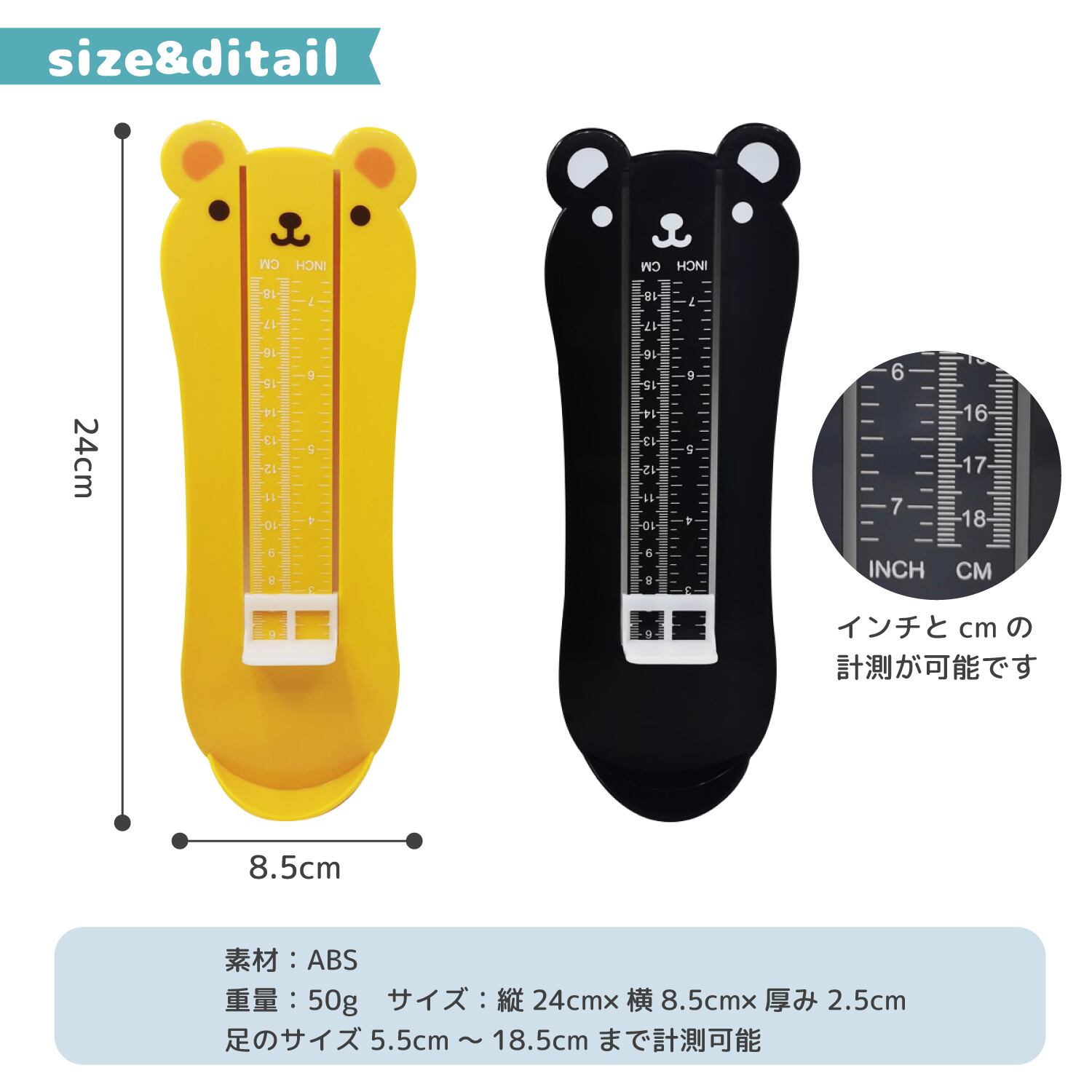 ネット通販で靴を買ったり試し履きができない時に自宅で簡単にサイズを測れる便利なキッズ用フットメジャー。くまさんデザインで、プレゼントにもおすすめです。