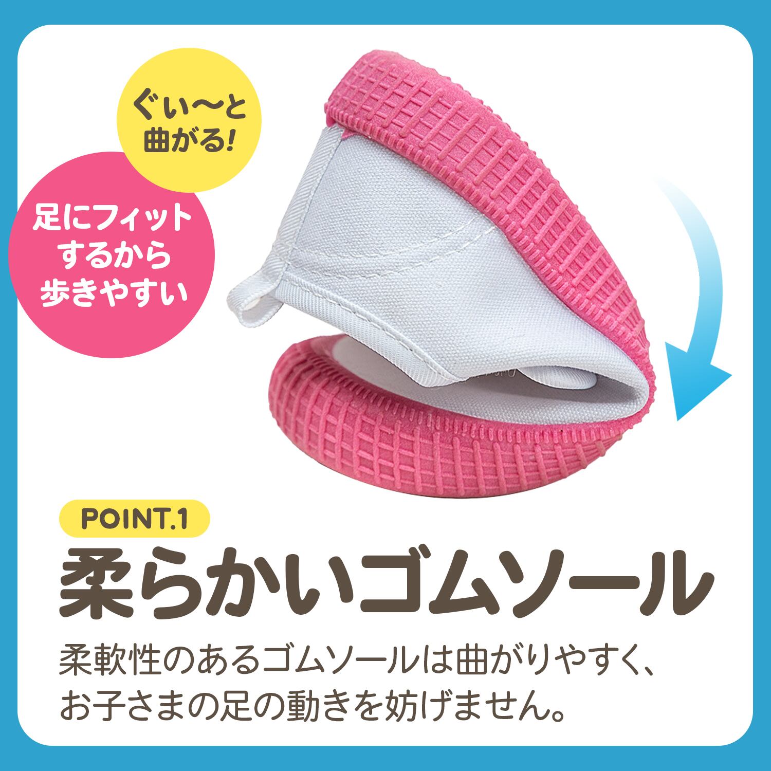 柔軟性のあるゴムソールは曲がりやすく、お子さまの足の動きを妨げません。