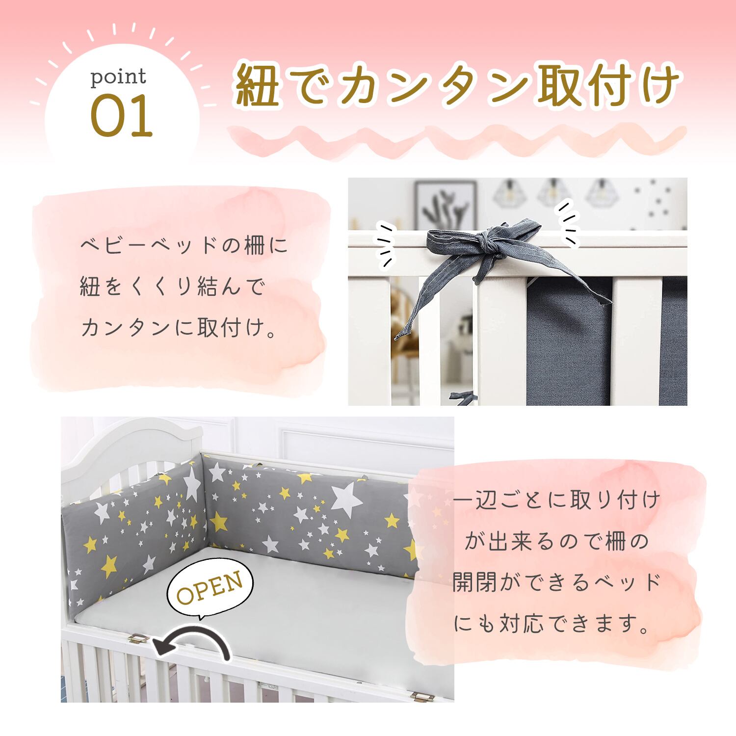 ベッドの柵にぶつかっても痛くない、紐でベッドの柵に簡単固定、洗濯もできていつでも清潔!