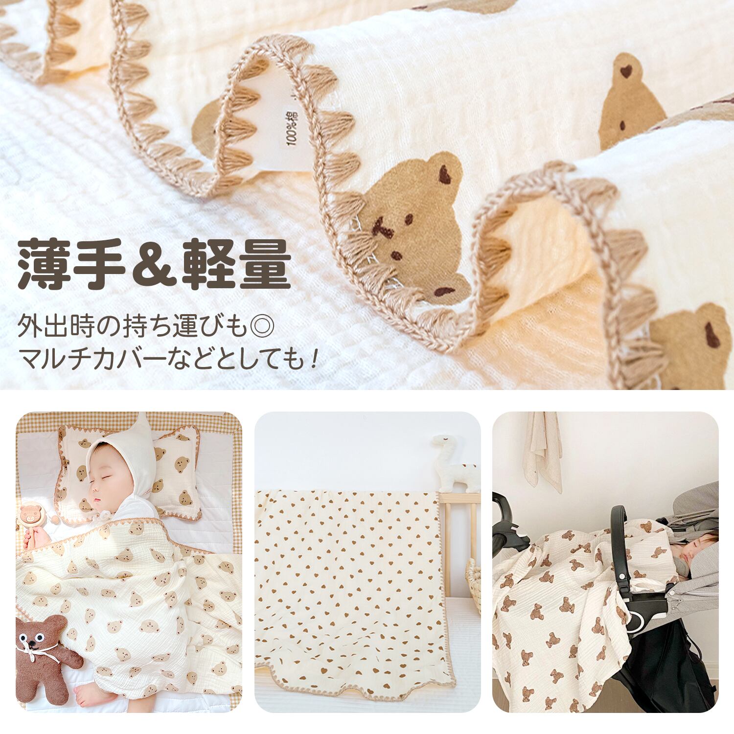 赤ちゃんに優しいふわふわのコットン100%ガーゼ生地。