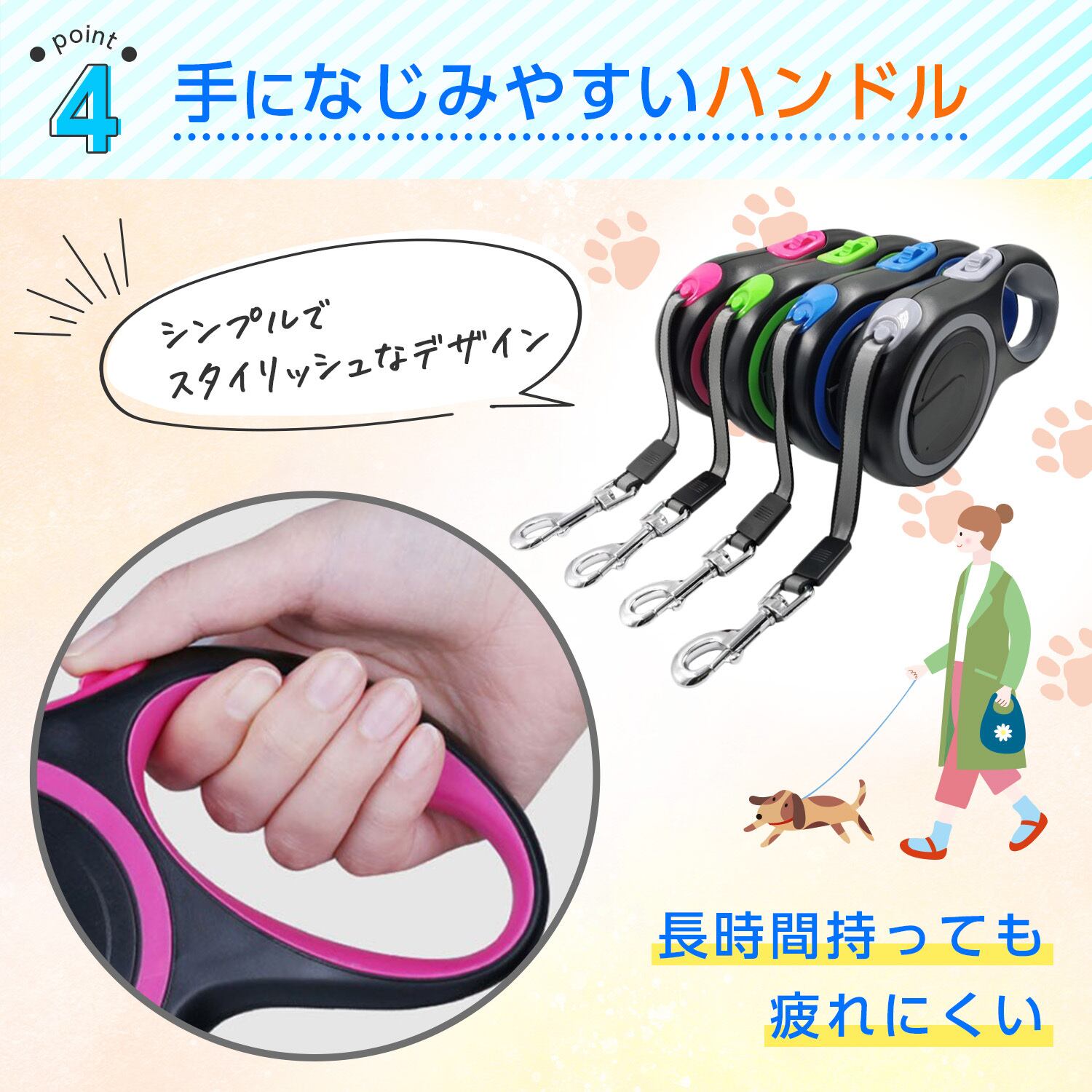 最大8mまで伸ばせるリードで、愛犬の動ける範囲がぐっと広がりいつものお散歩がもっと自由に楽しくなります。