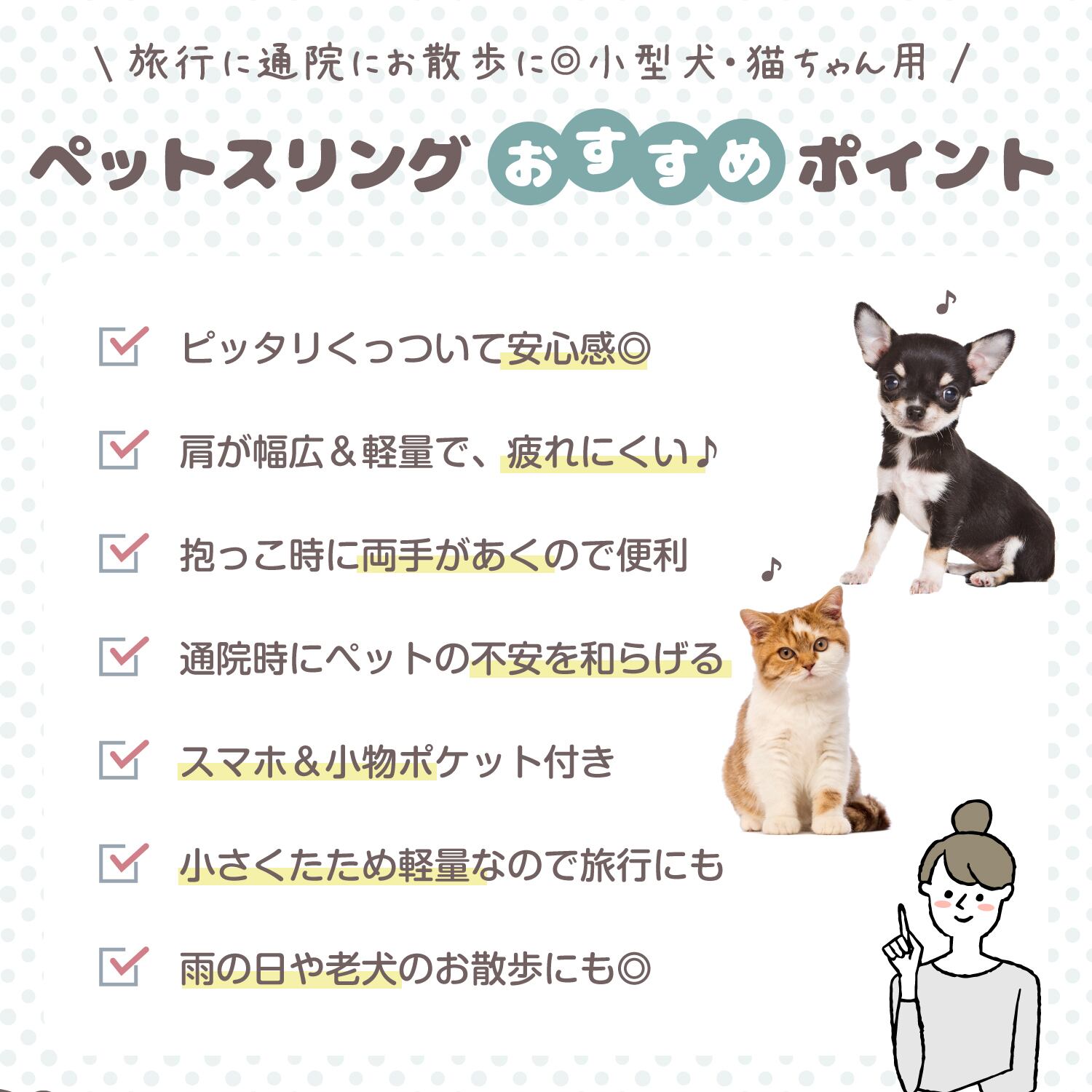 いつでもどこでもペットと一緒に快適にお出かけできるペットスリングです。両手が自由になるので、荷物が多い日や雨の日も楽々です♪家庭で選択できるのでいつも清潔に。