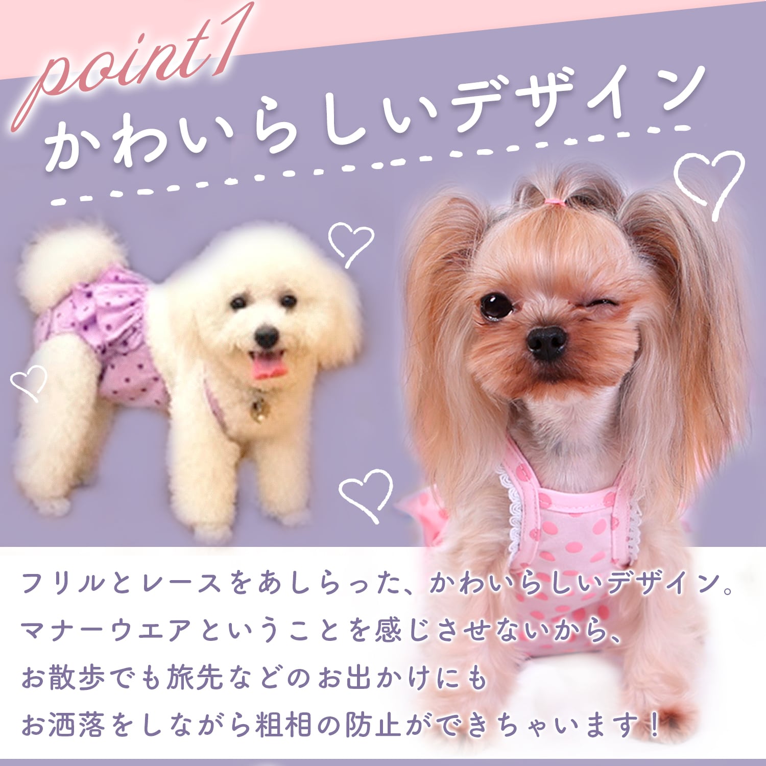 フリルとレースをあしらった、かわいらしいデザイン。マナーウエアということを感じさせずお洋服のように使用できます。