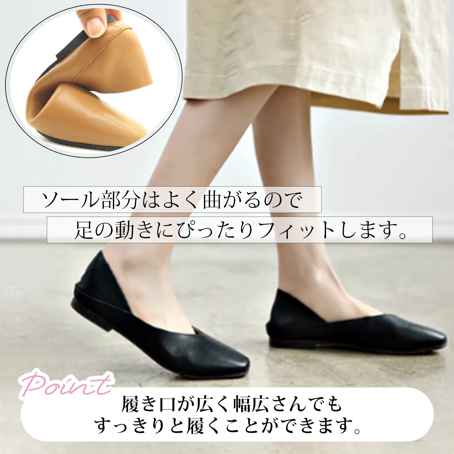 かかとを踏んで、バブーシュとしてもお使いいただける2way仕様です。