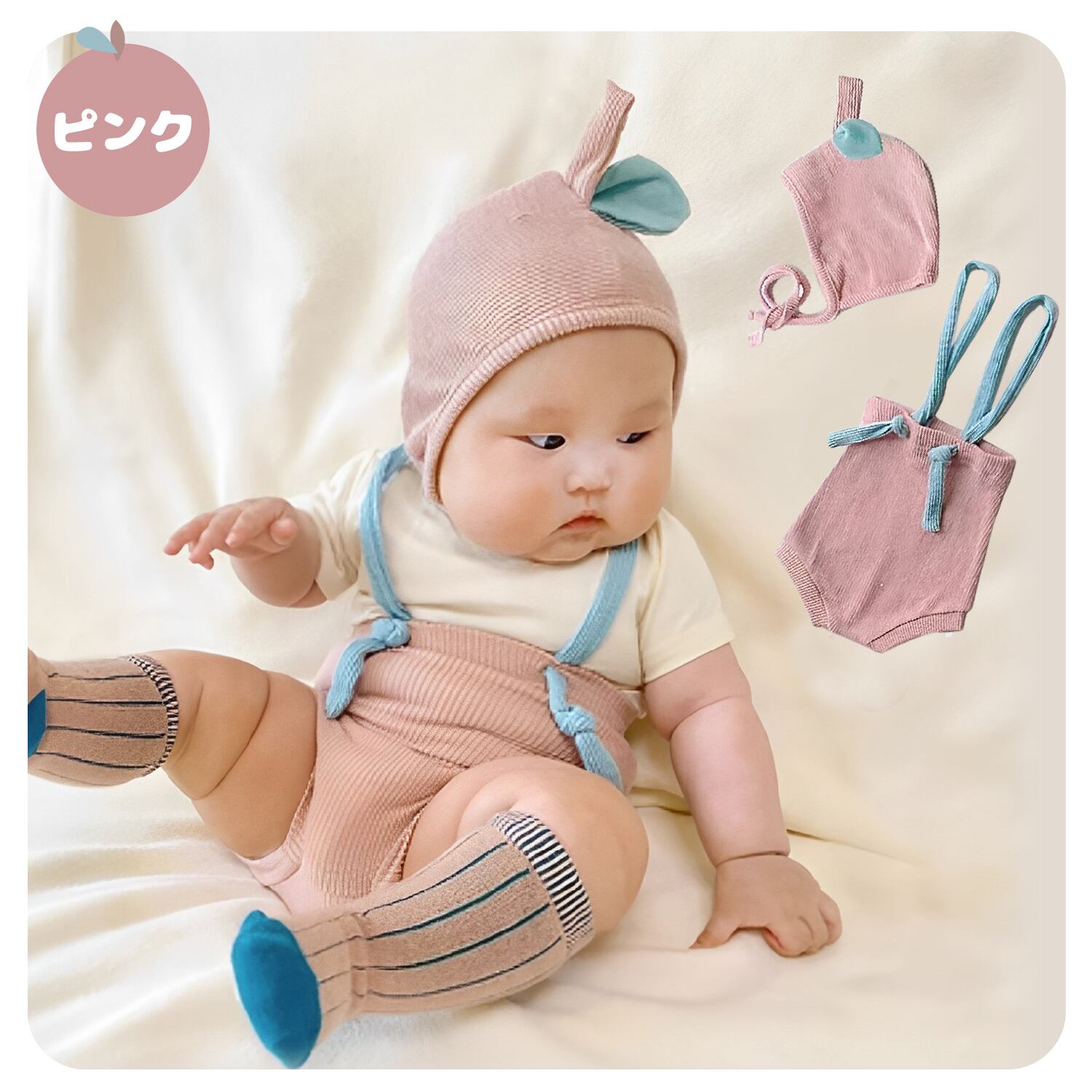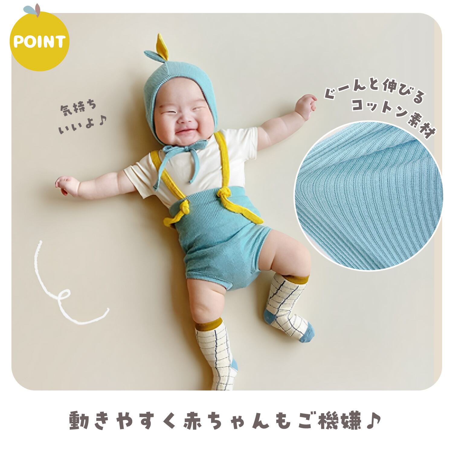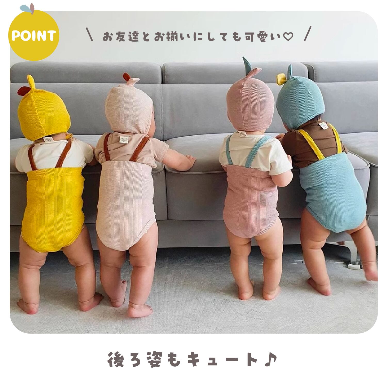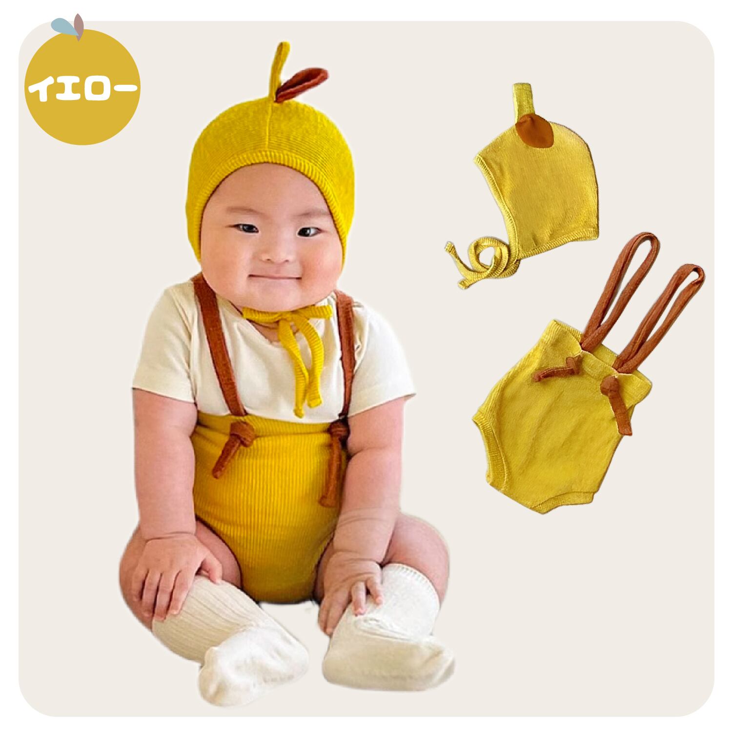 まるで絵本から出てきたような、フルーツの妖精のような小人さんのようなかわいいサロペット&帽子のセットです。パーティに兄弟やお友達とのリンクコーデもかわいい♪