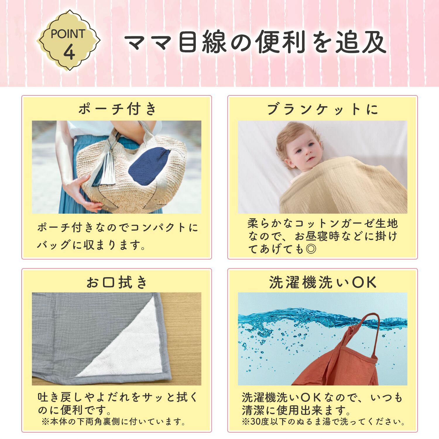 大判サイズで赤ちゃんとママの体を包み込み、周りからの視線が気になりません。