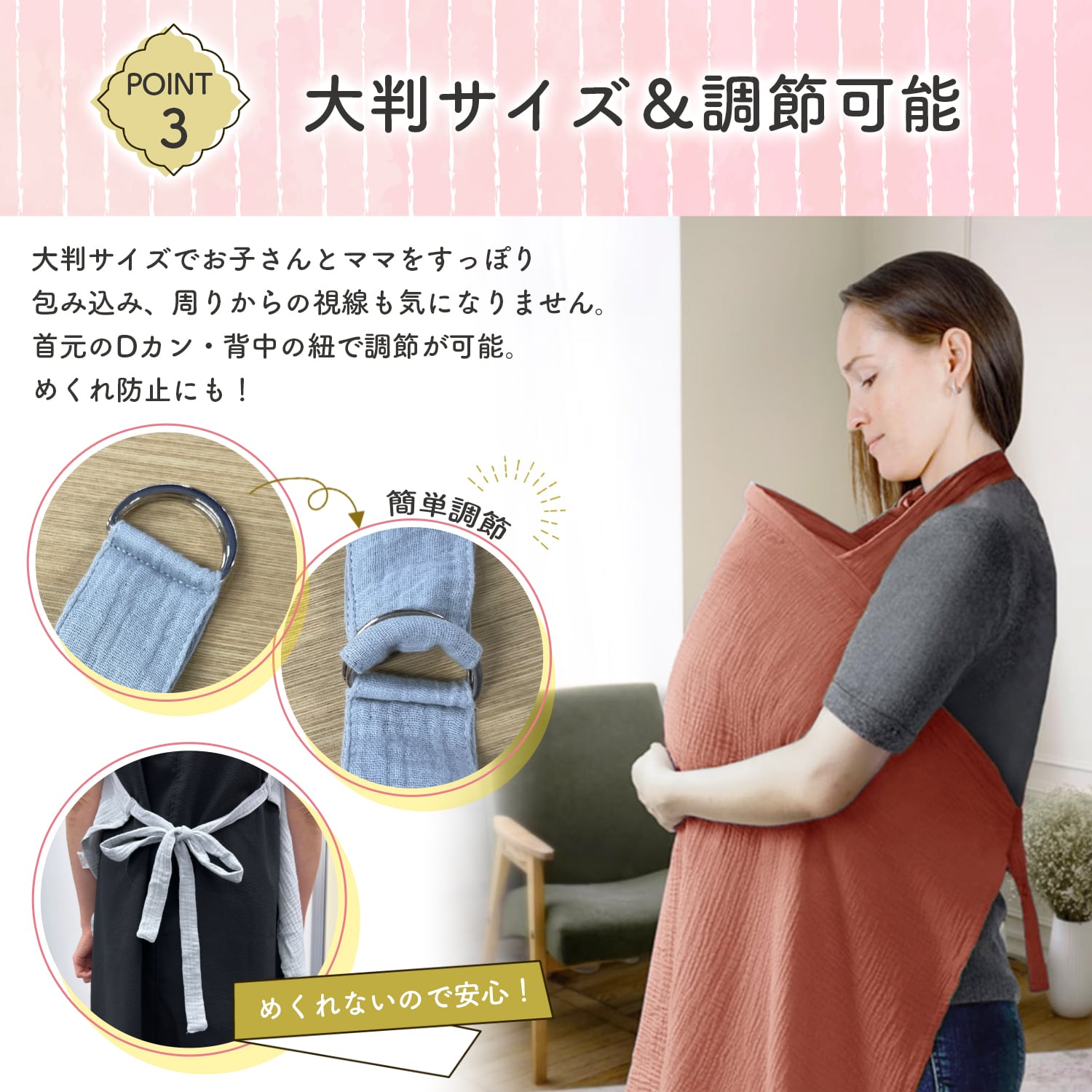 首元はDカンで、後ろは紐を結んでサイズ調整可能!赤ちゃんが引っ張ったり、風が吹いてもめくれる心配がありません。