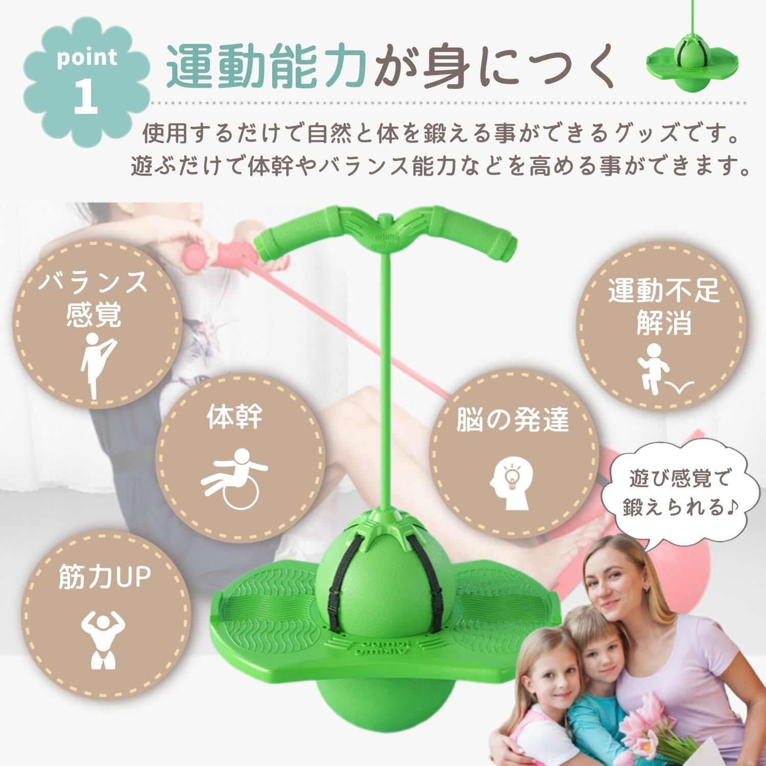 ホッピングとしてジャンプを楽しむ以外にも、紐を引っ張って筋肉トレーニングに使用したり、紐を外してバランスボールとして遊んだり、工夫次第で色んな遊びができます。