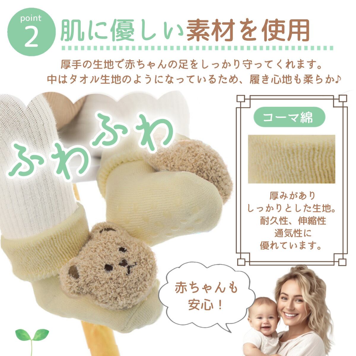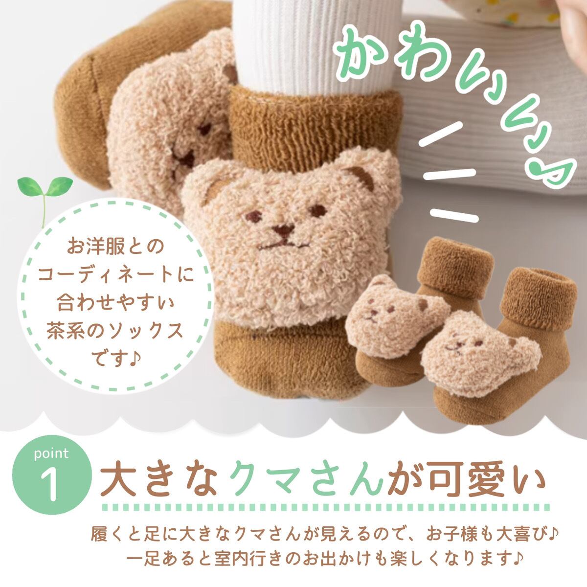大きなクマさんの立体マスコットがついているルームソックスです。ご自宅で履くのはもちろん、帰省、お友達のおうちにお呼ばれした際など、我が子のかわいさが一段と増しちゃいます♪