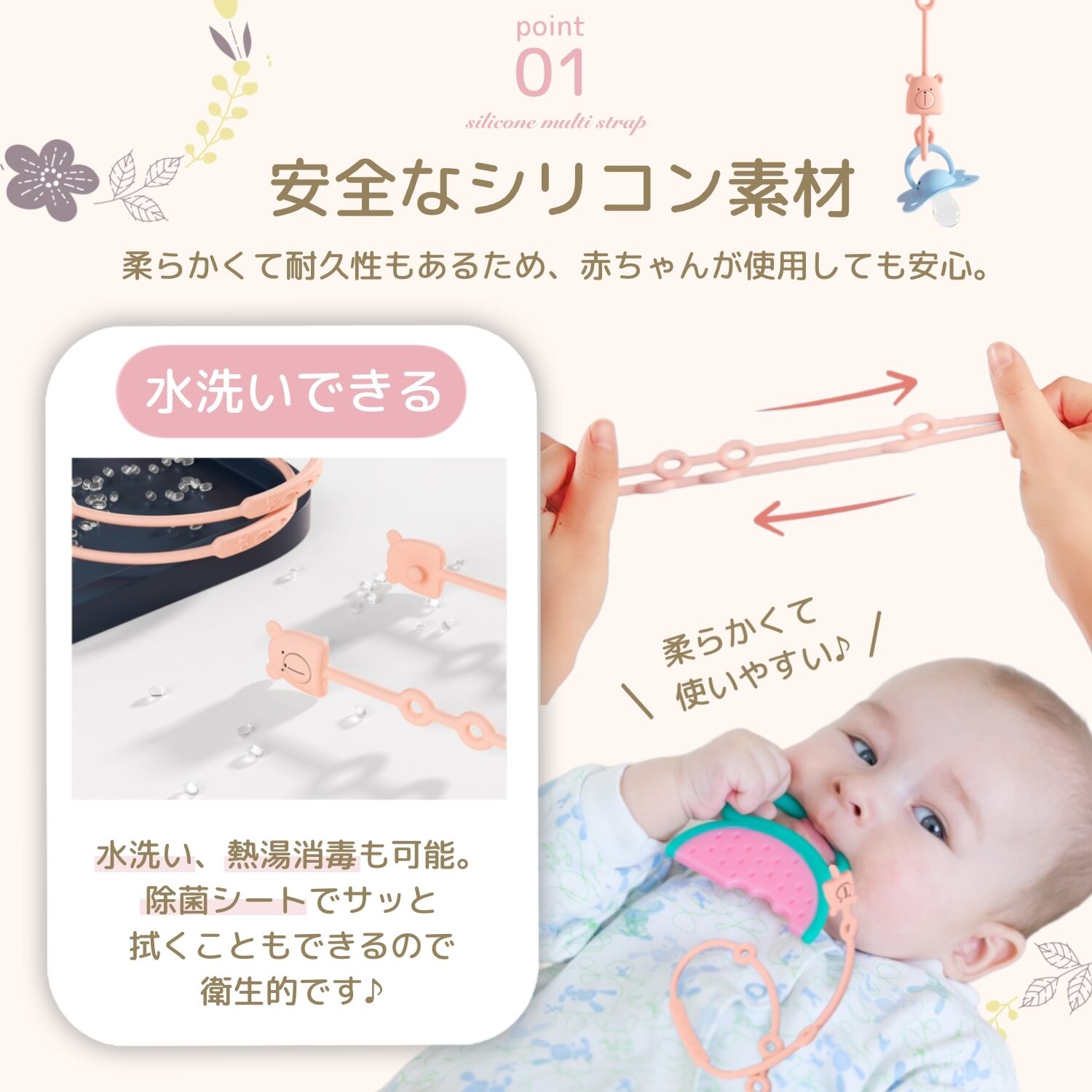 赤ちゃんがついうっかり落としてしまいやすいおしゃぶりやオモチャを、ベビーカーやバウンサーなどに固定する事ができます。大切な物を落とさないように守ってくれます。