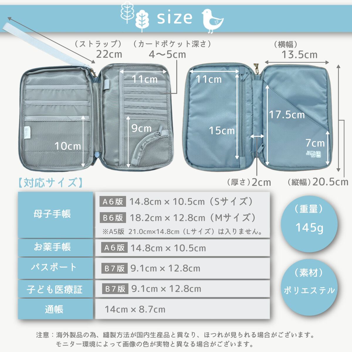 母子手帳ケースとしてはもちろん、お薬手帳ケース・通院ポーチ・ペットの健康手帳ケース・手帳カバー・手帳ケース・通帳ケース・パスポートケース・ブックカバーとしても使えます。