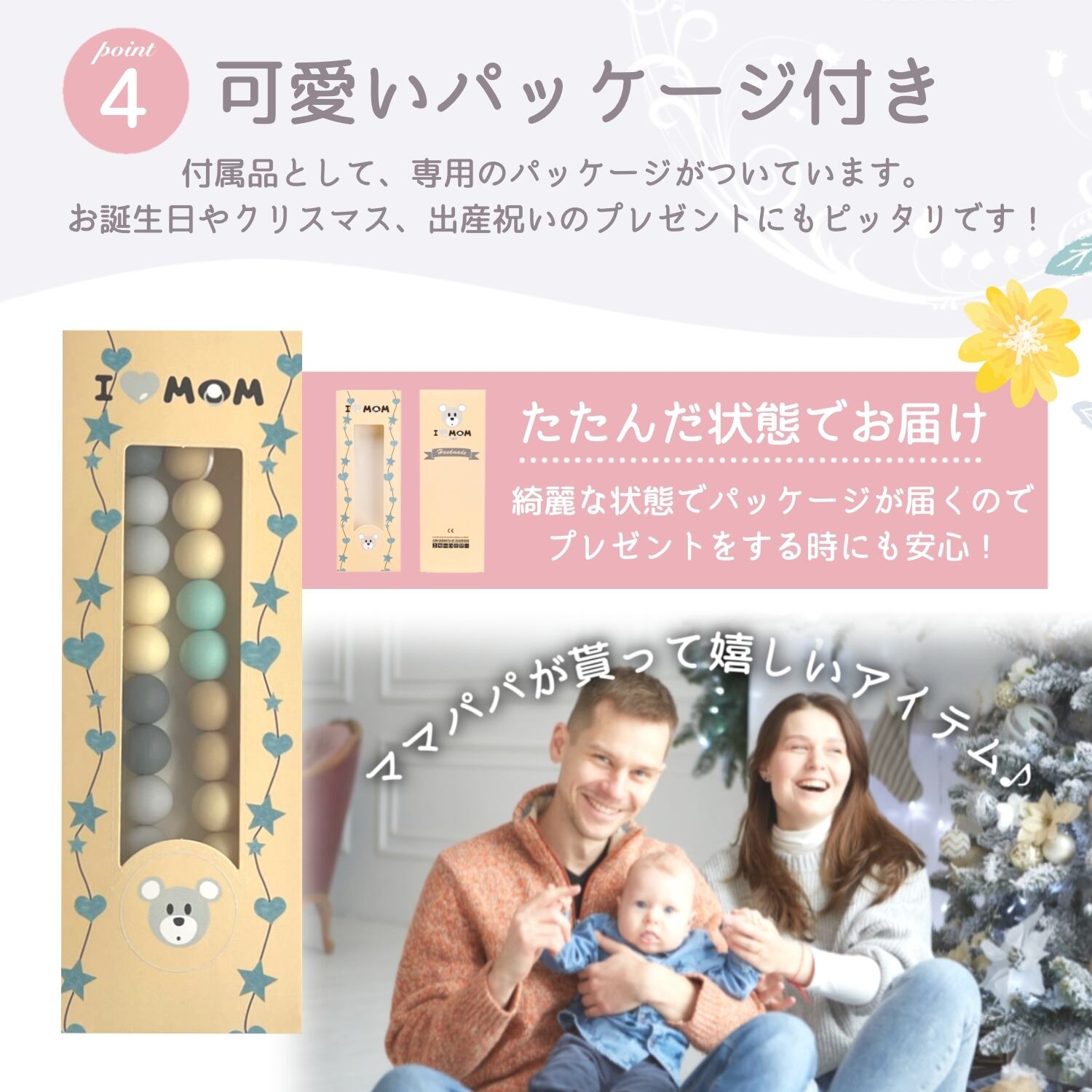 柔らかいシリコン素材のビーズを使用しています。赤ちゃんが使う時に当たったり触ったりしても心配なく、赤ちゃんに優しい設計になっています。