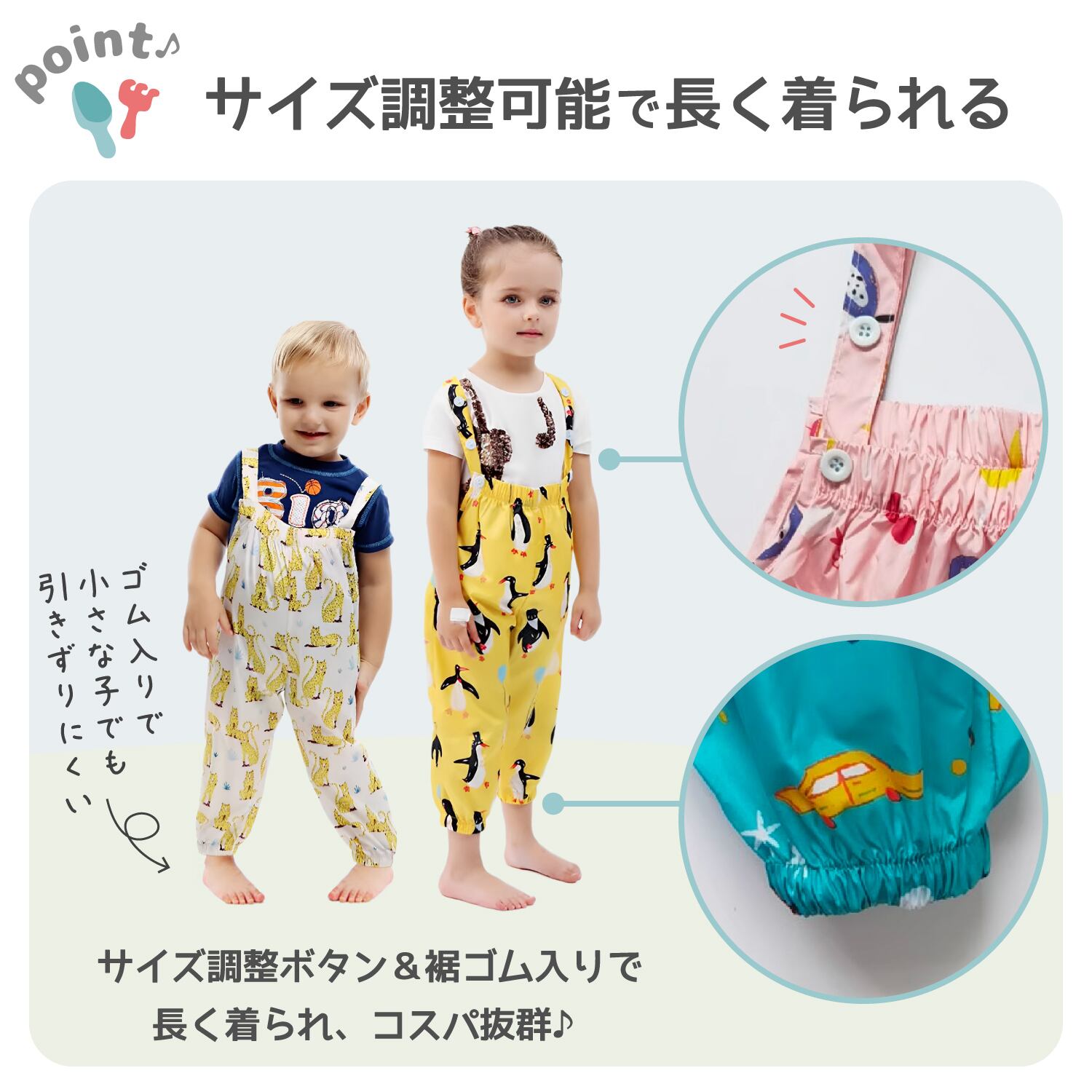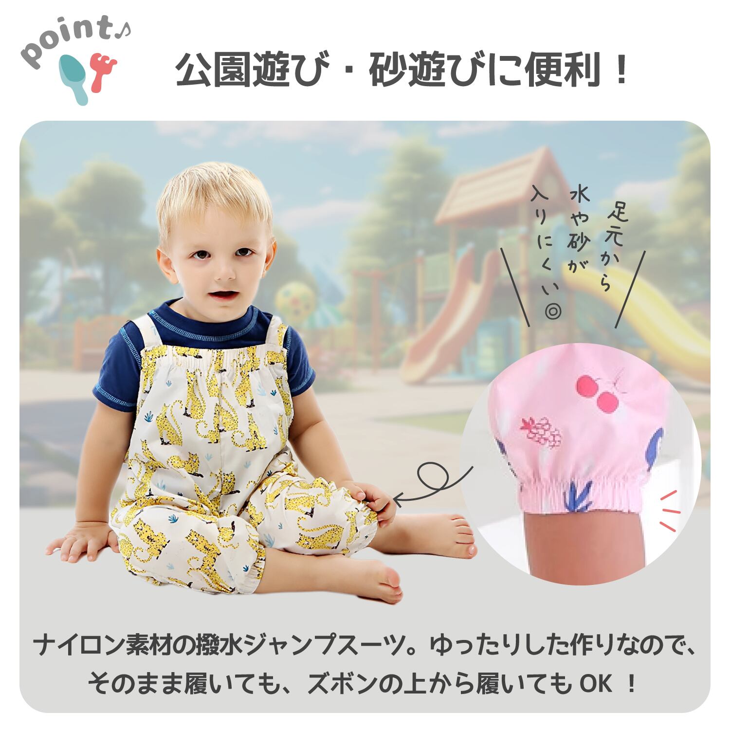 ナイロン素材の撥水ジャンプスーツ。砂遊び、泥遊びの時や、雨の日のお出掛けに便利。ゆったりした作りなので、そのまま履いても、ズボンの上から履いてもOK。