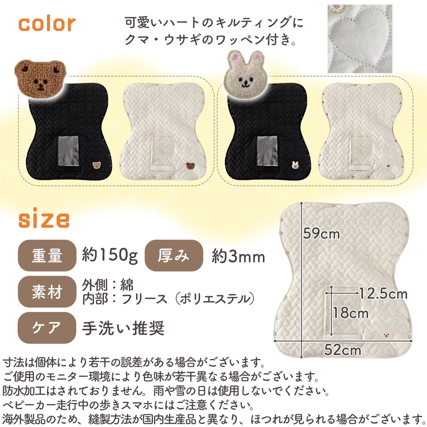 デザインがとってもかわいい!ハート形のキルティングに、くまさん、うさぎさんのワッペン付き。贈り物にも喜ばれます。