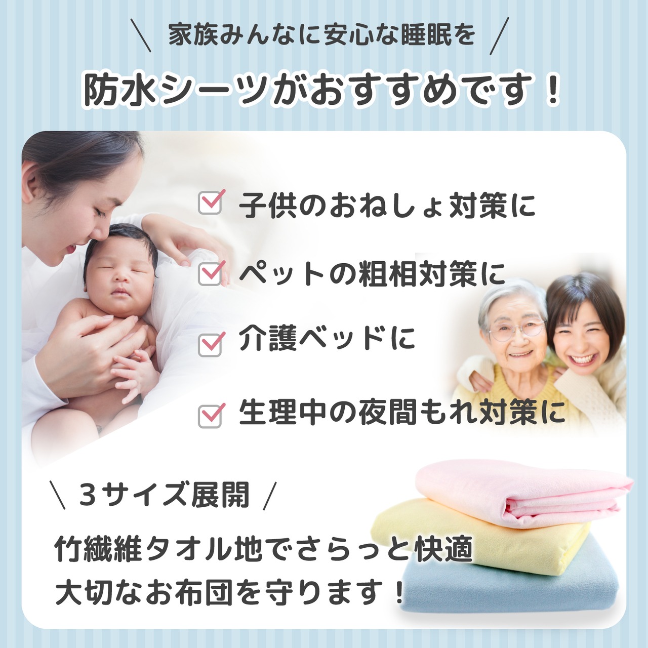 お子様のおねしょ対策はもちろん、介護や寝汗対策、ペットのお気に入りのソファに敷くなど、毎日大活躍の防水シーツです。