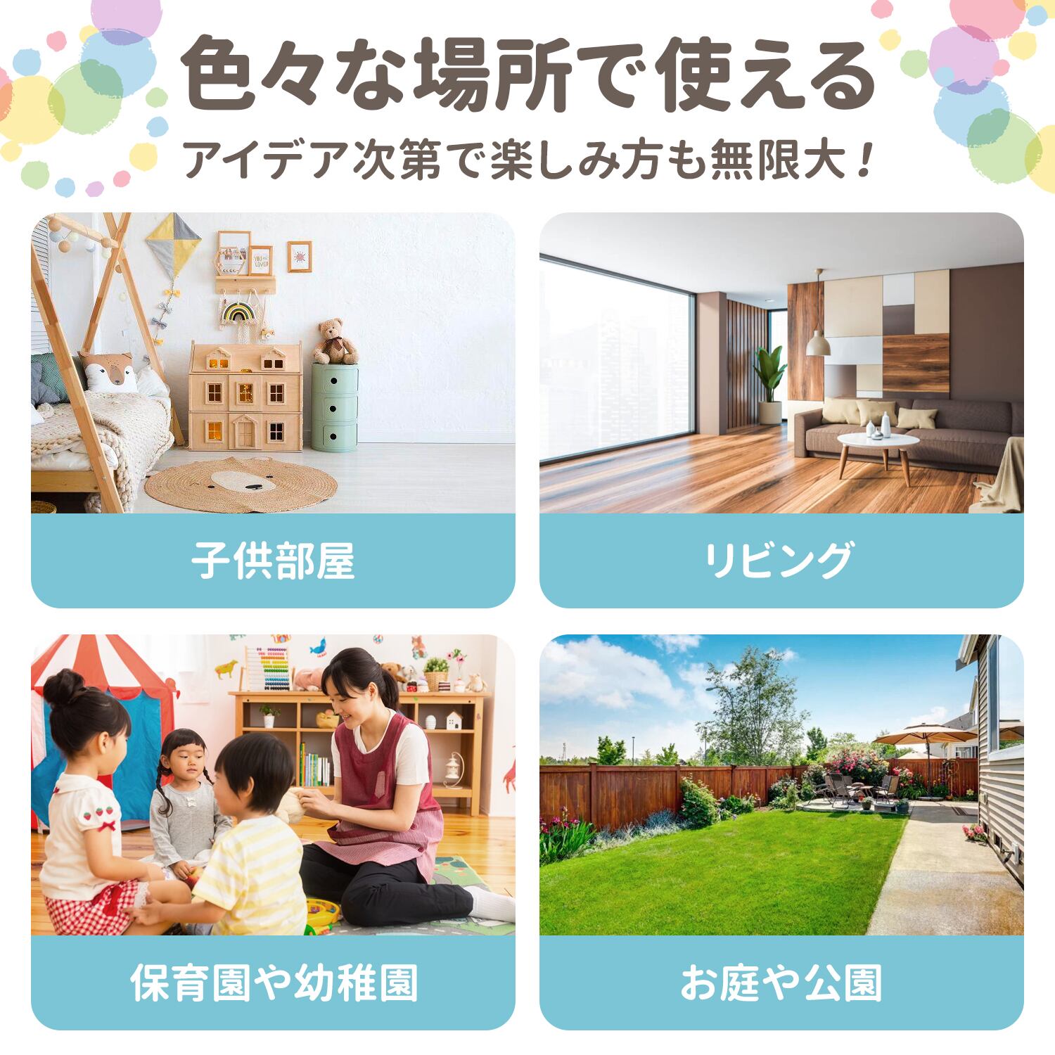 それぞれのストーンが軽量なので、子供部屋やお庭、リビングなど使用したい場所への持ち運びも楽々。保管の際も場所を取らずに省スペースでOK。