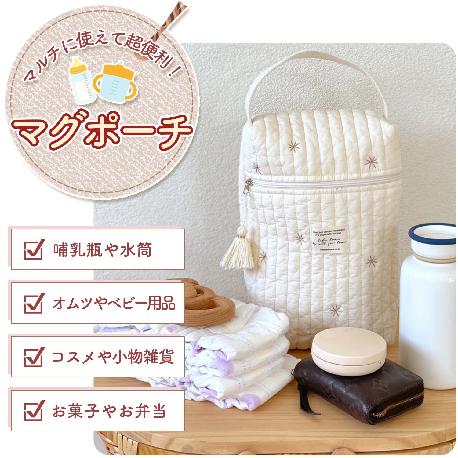 哺乳瓶やお水、ミルク、水筒などがスッポリ収納できるマルチポーチです!