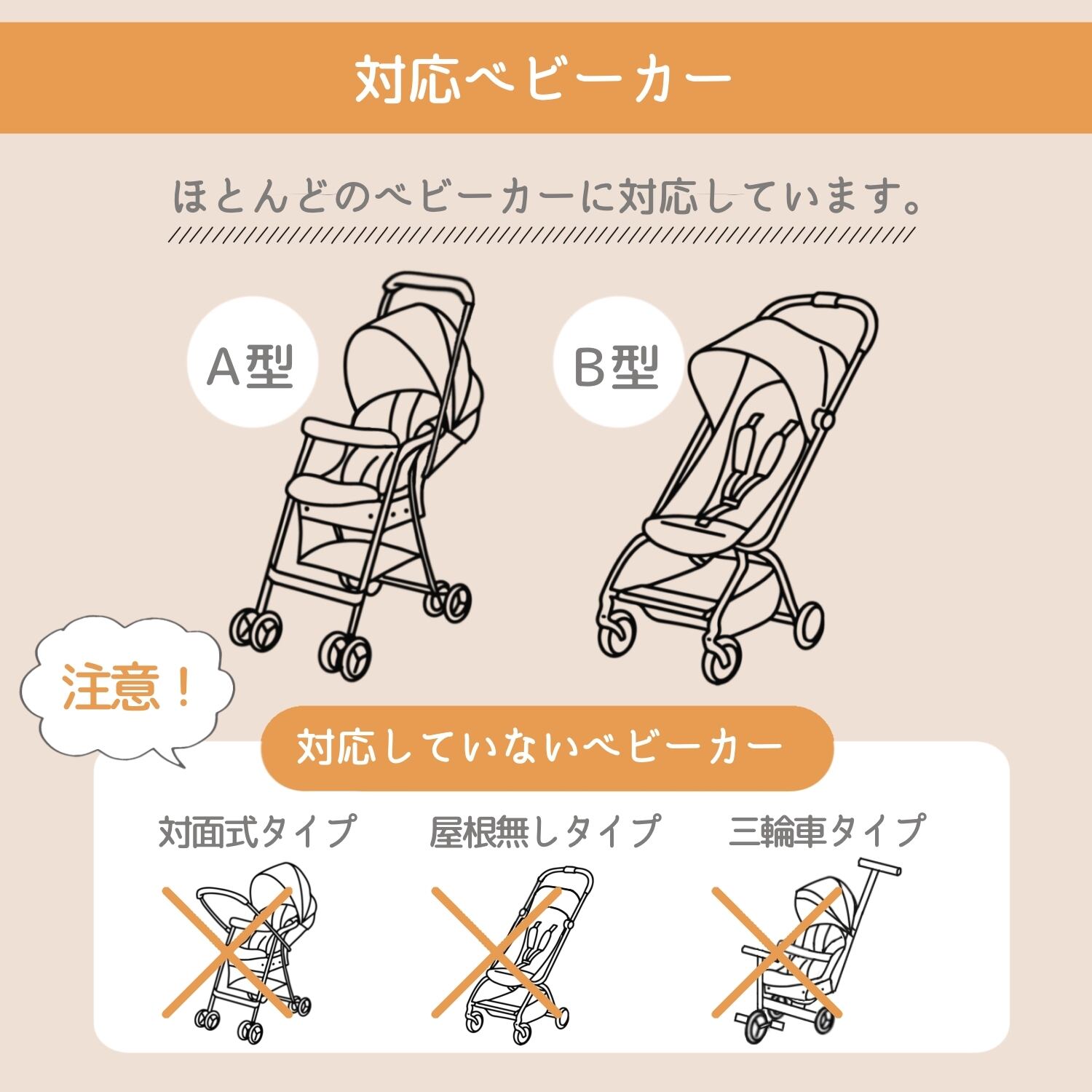 ベビーカーの上に置いて手持ち部分に4箇所、カートの下部分1箇所のストラップをつけるだけで簡単に取り付ける事ができます。お出かけ先や天気に合わせて取り付けたり、不要な時は簡単に外せるため便利です!